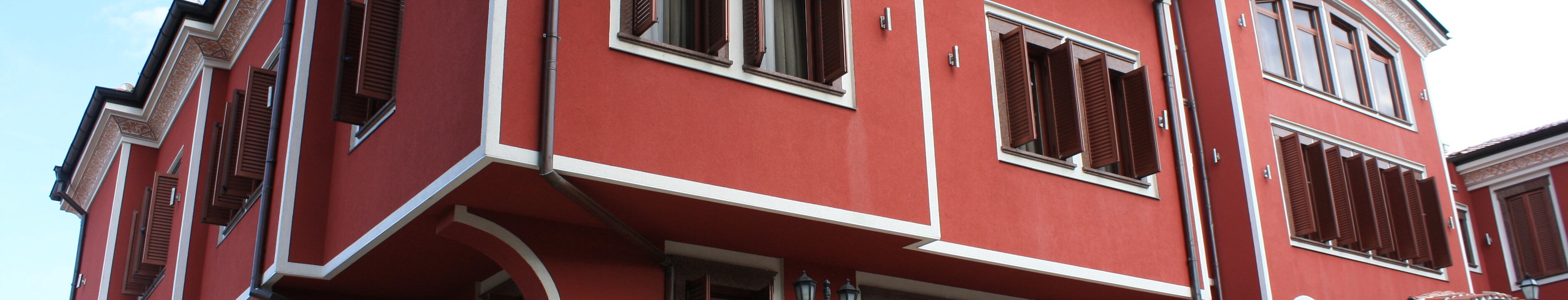 House in Plovdiv baroque style, with convex and concave shapes, painted walls and wooden elements.