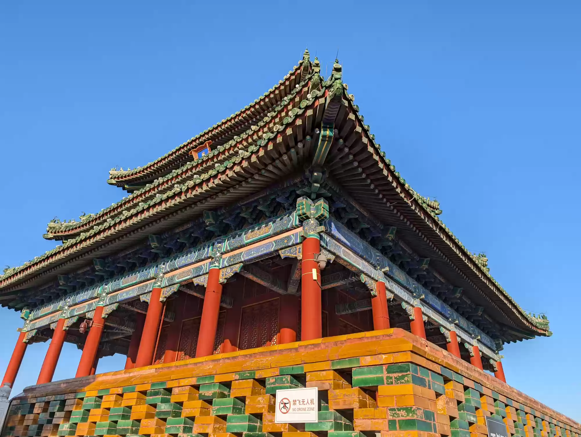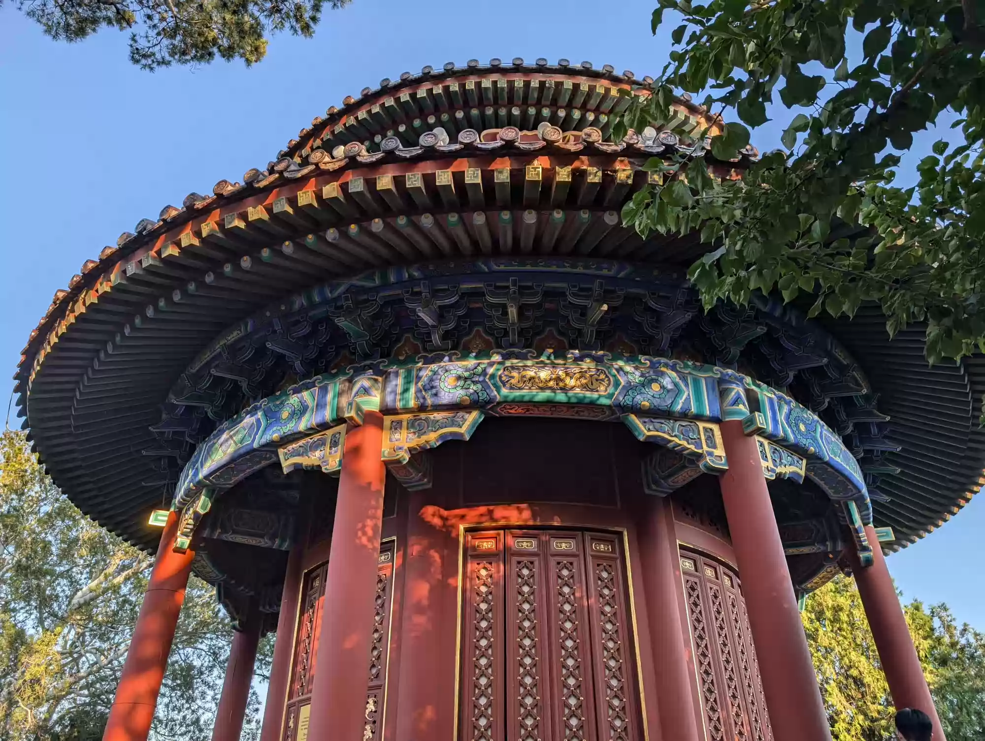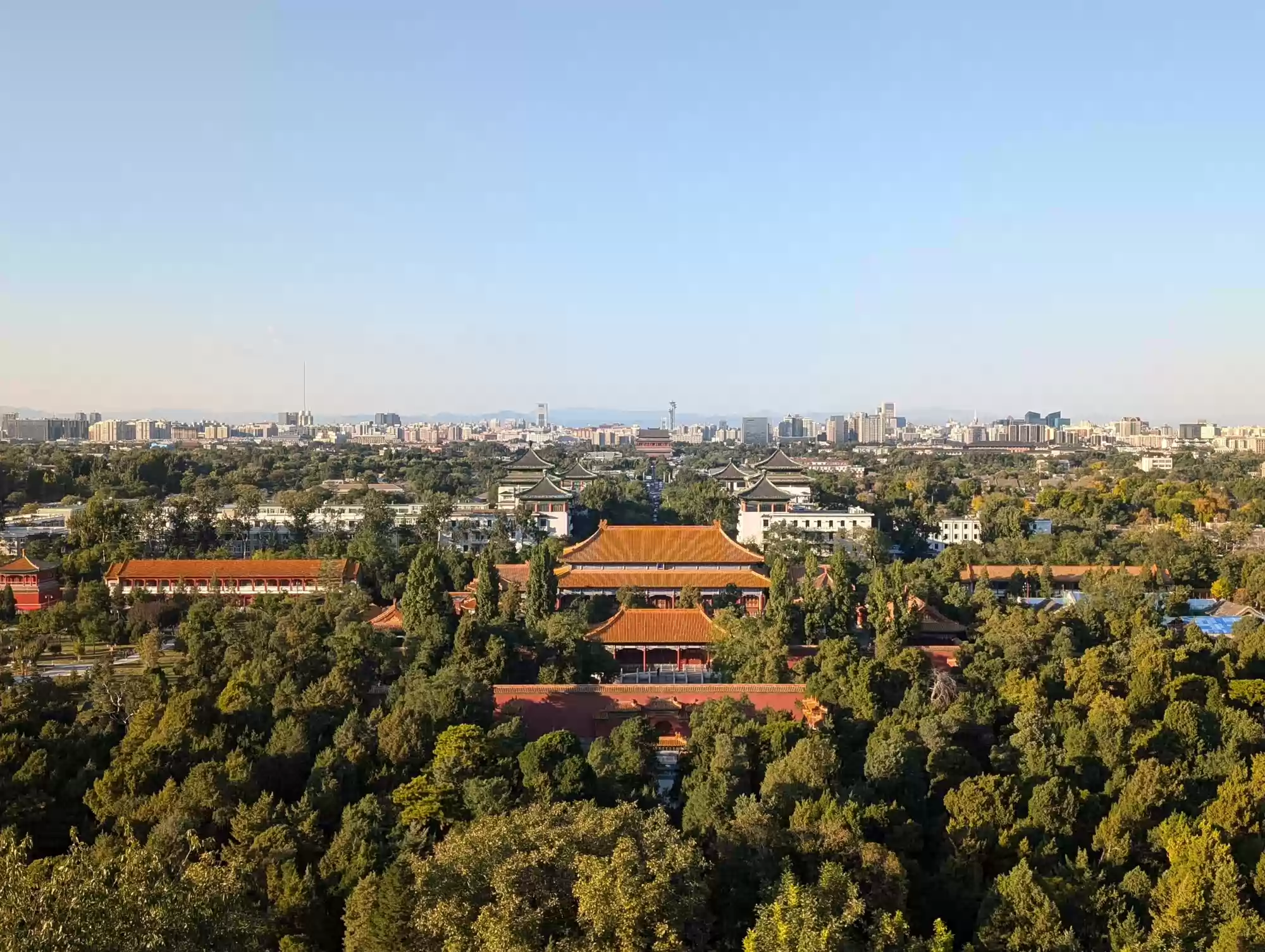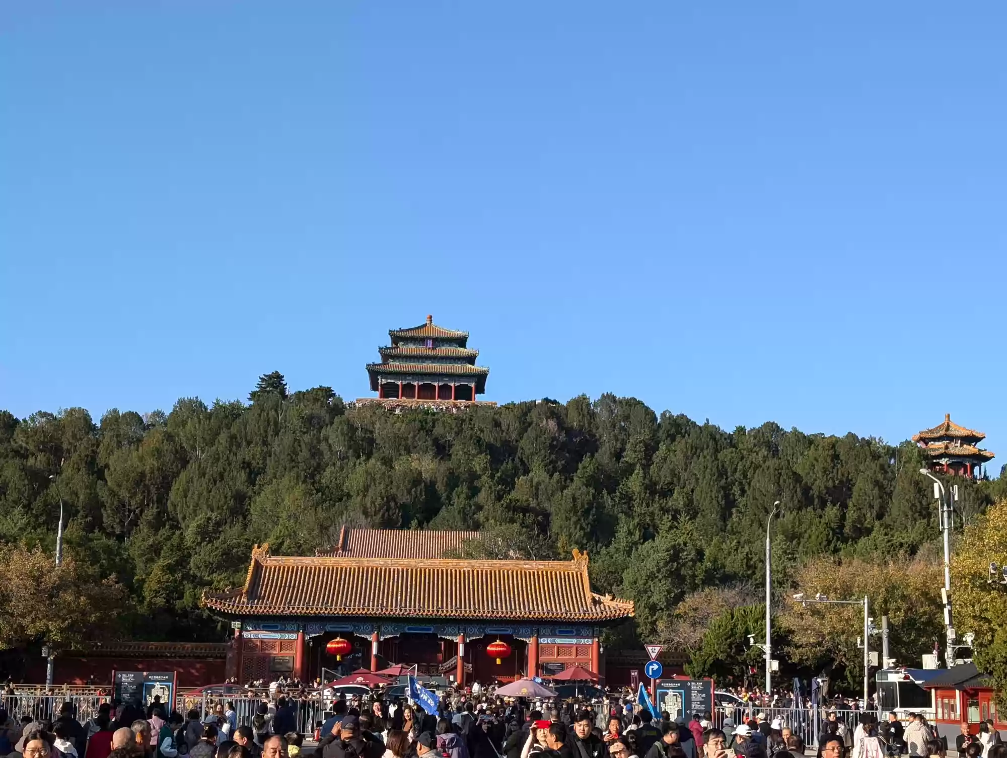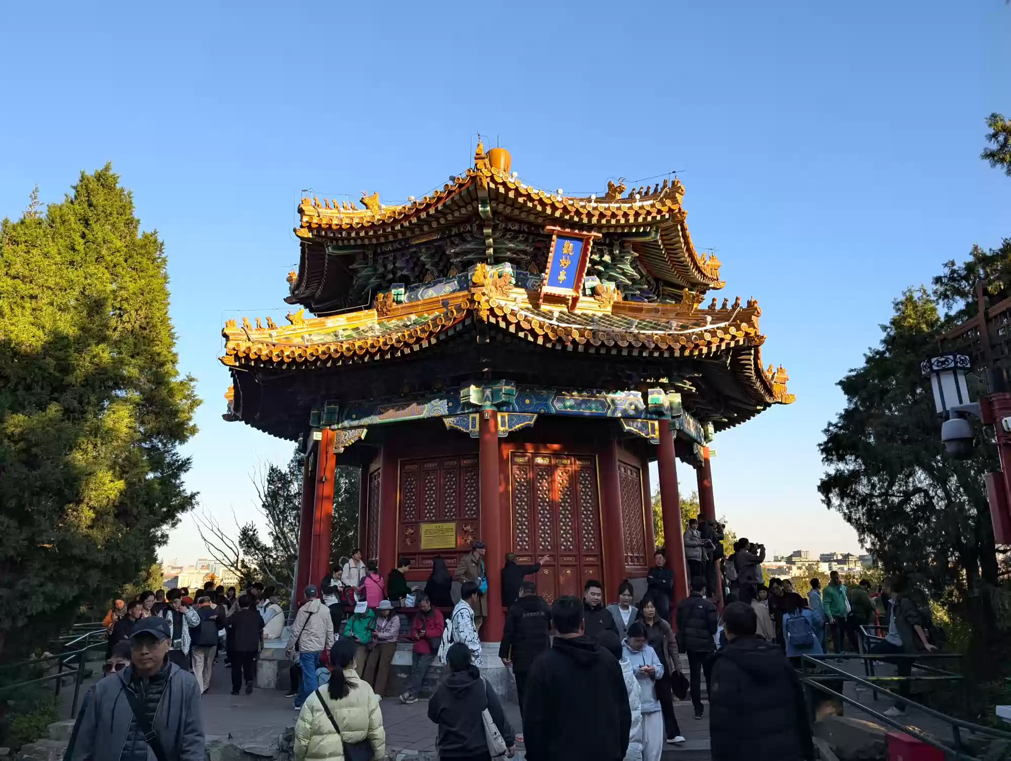 Jingshan Park, an imperial garden previously part of the Forbidden City. The manmade hill was built with earth excavated to dig the Forbidden City moats. Forbidden City moat. Fulan Pavilion, 1750. Originally a Buddhist temple. Forbidden City. Guanmiao pavilion, 1750. Zhoushang pavilion, 1750. Treasure gallery Labels