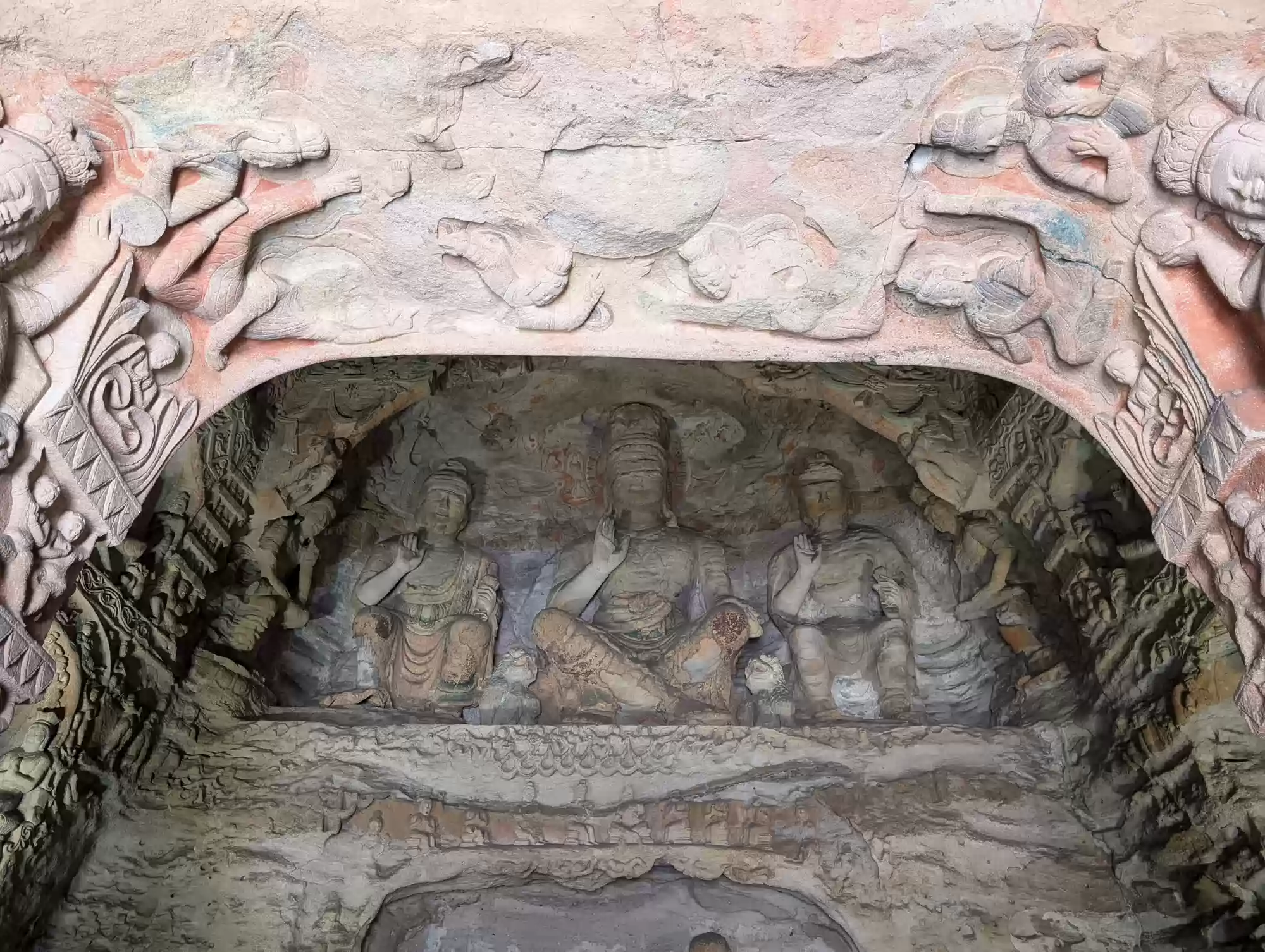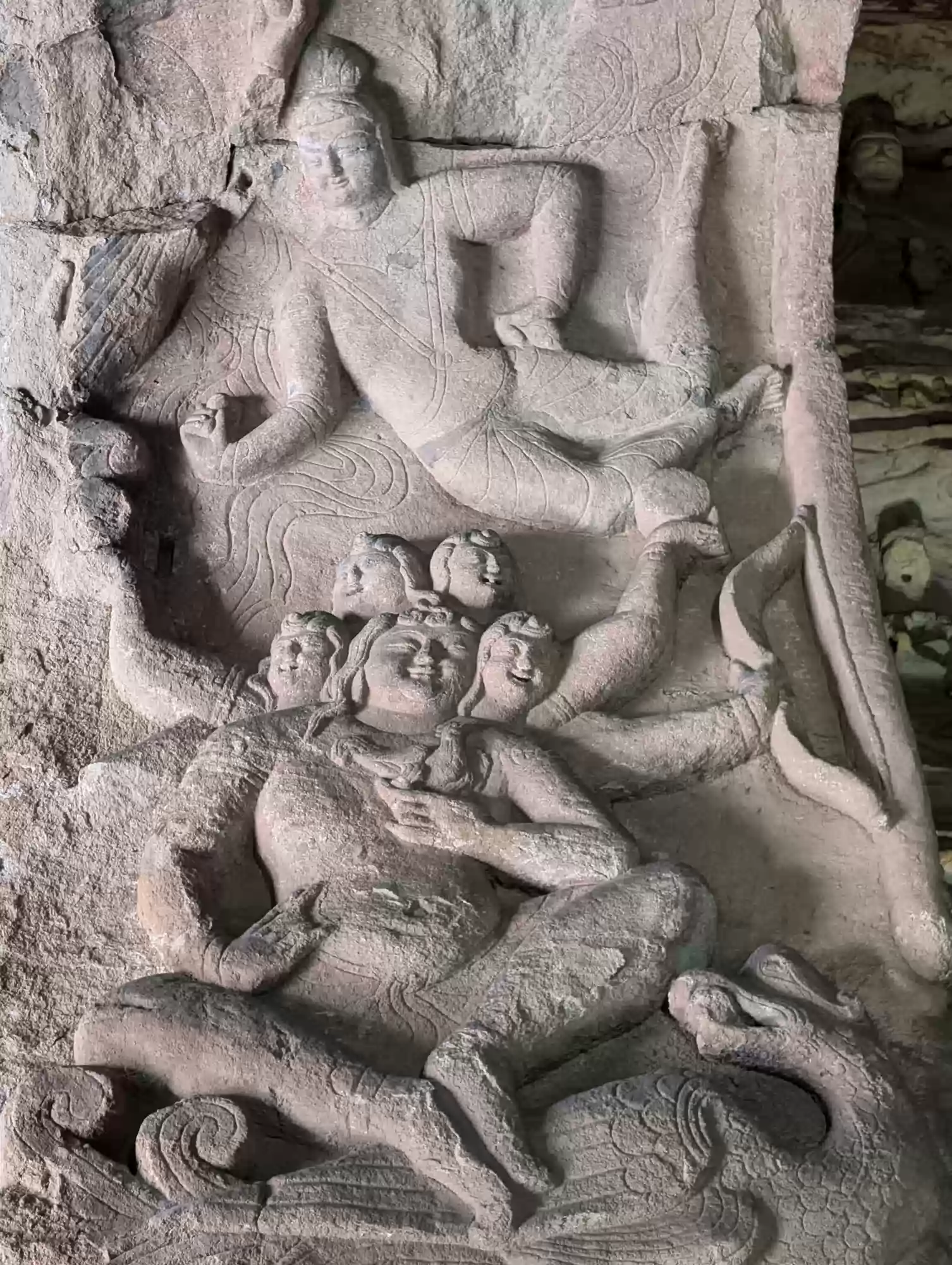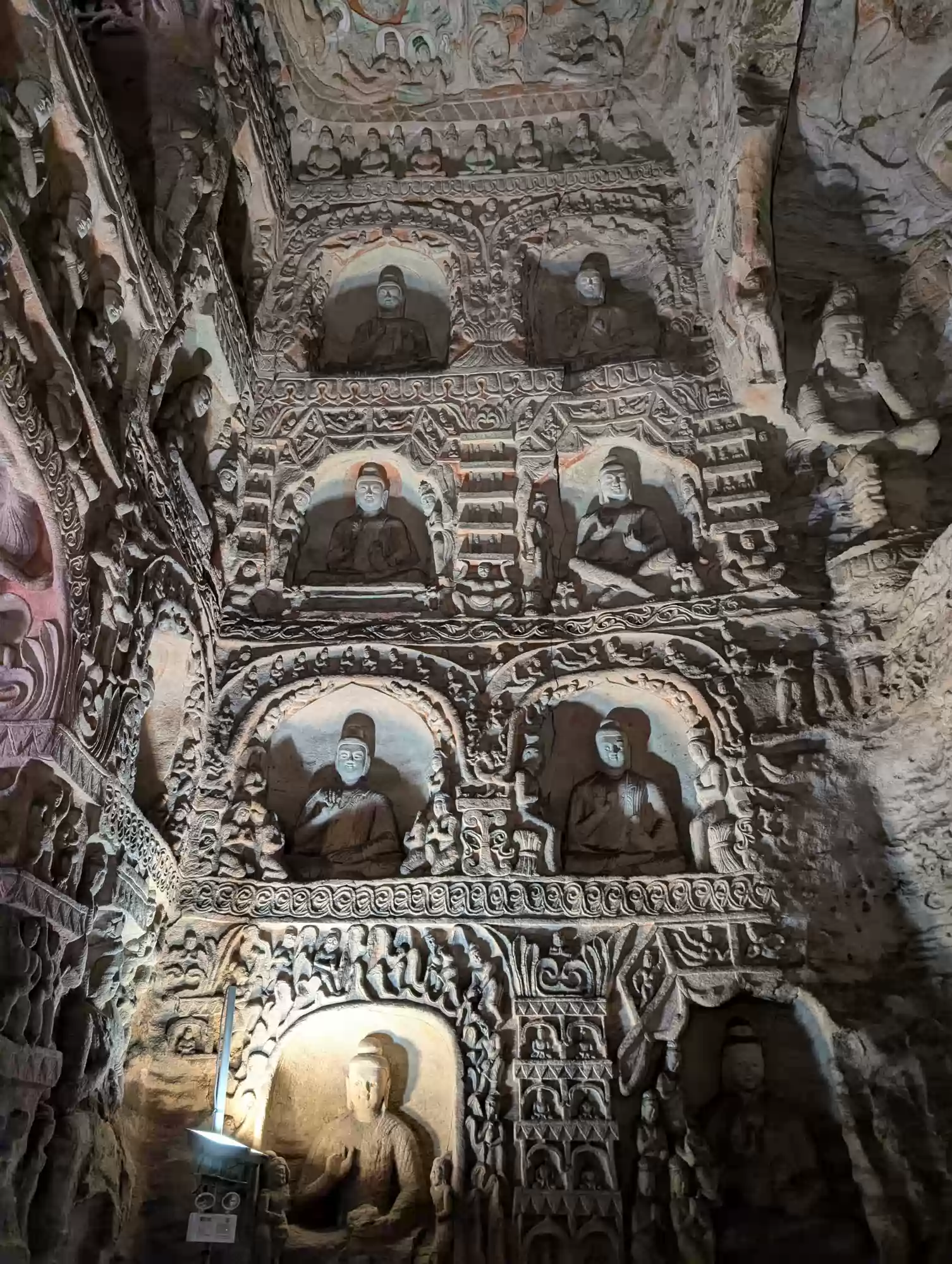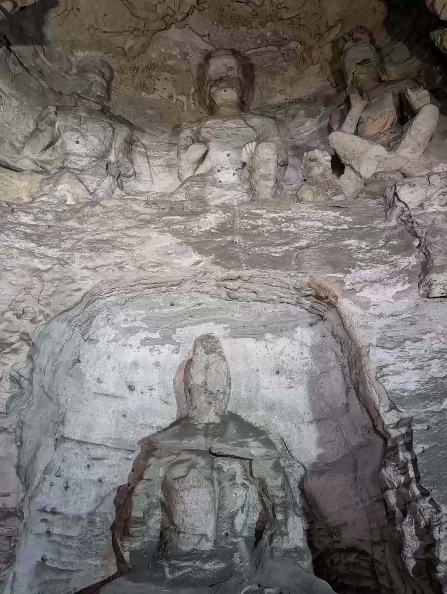 The right cave has a front and back chambers. The main chamber is horizontal rectangular shape. The sculptures in the cave show the mixed style of both Han…