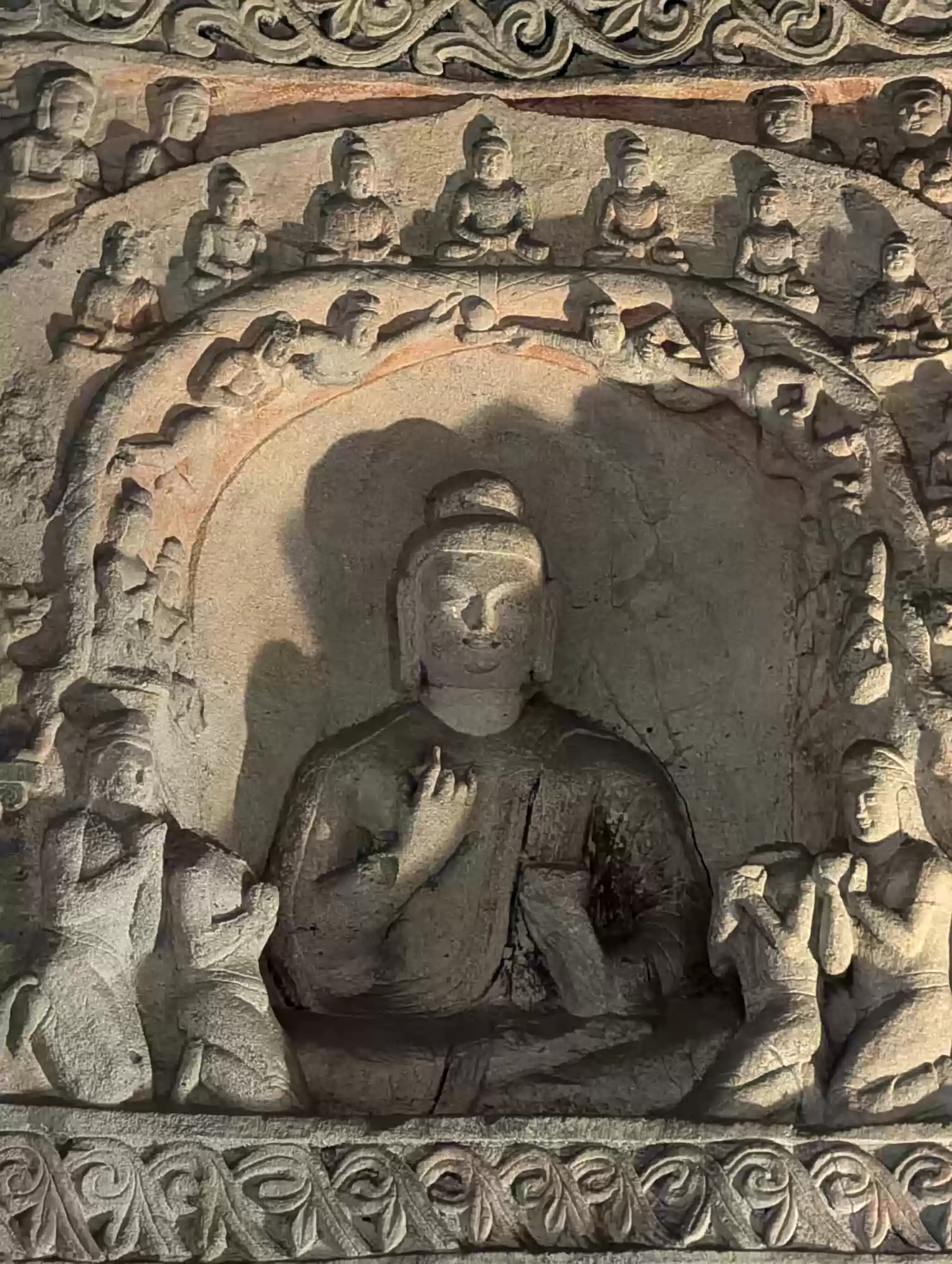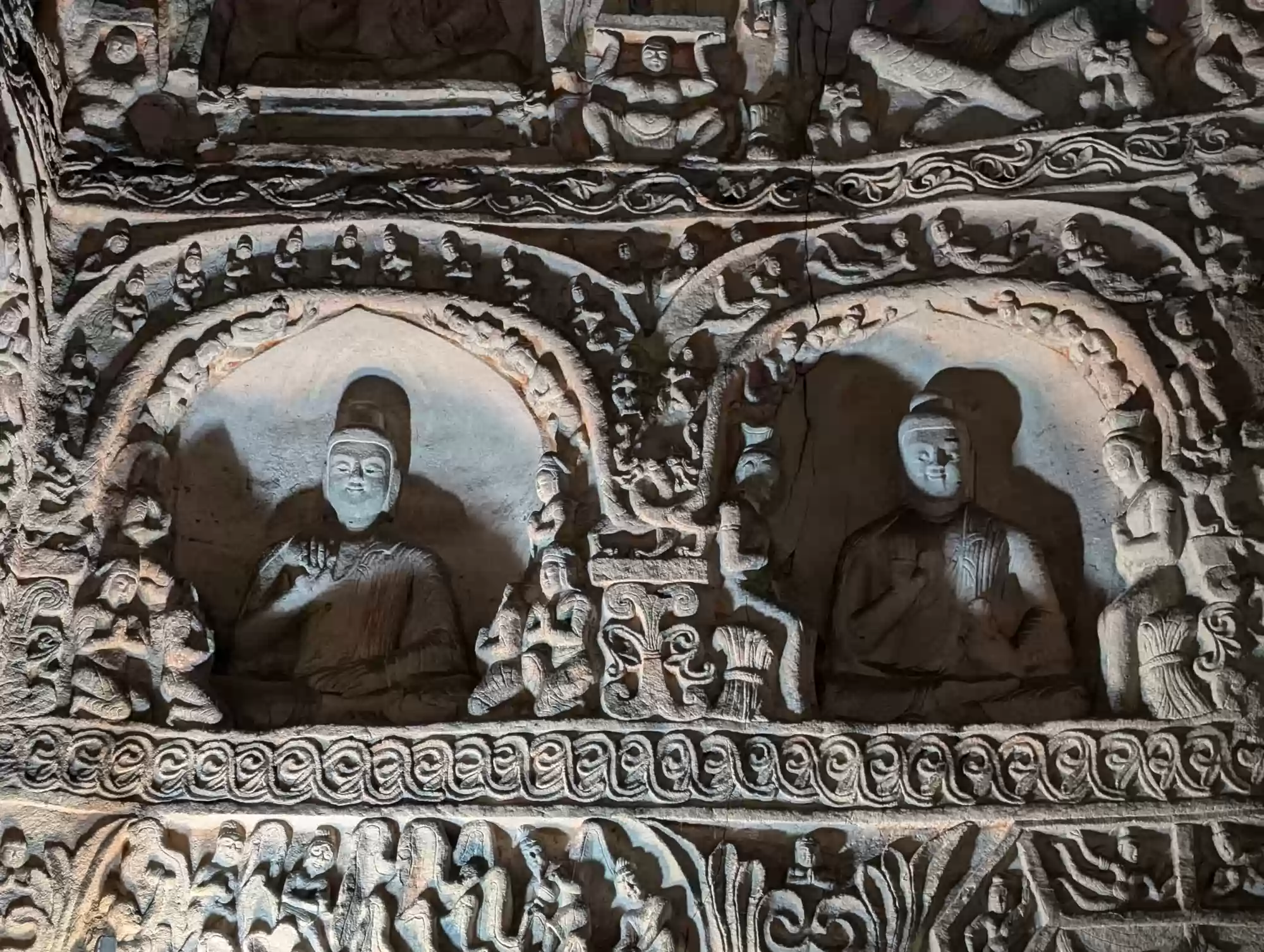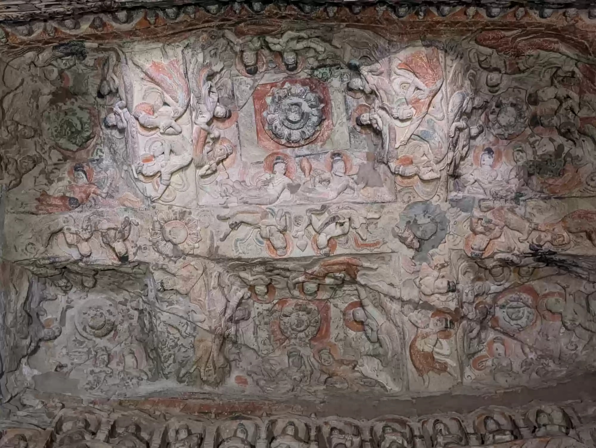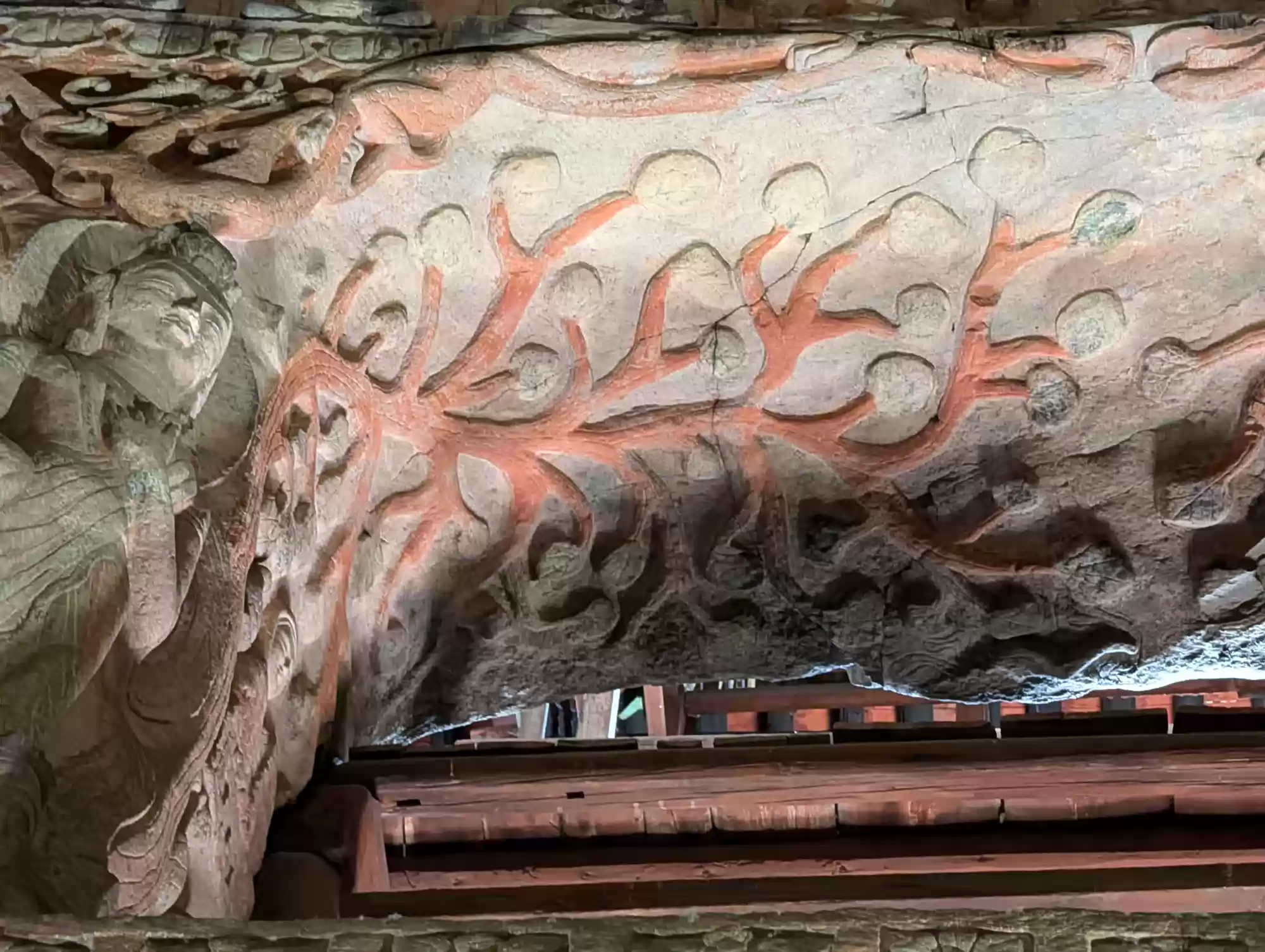 The right cave has a front and back chambers. The main chamber is horizontal rectangular shape. The sculptures in the cave show the mixed style of both Han…