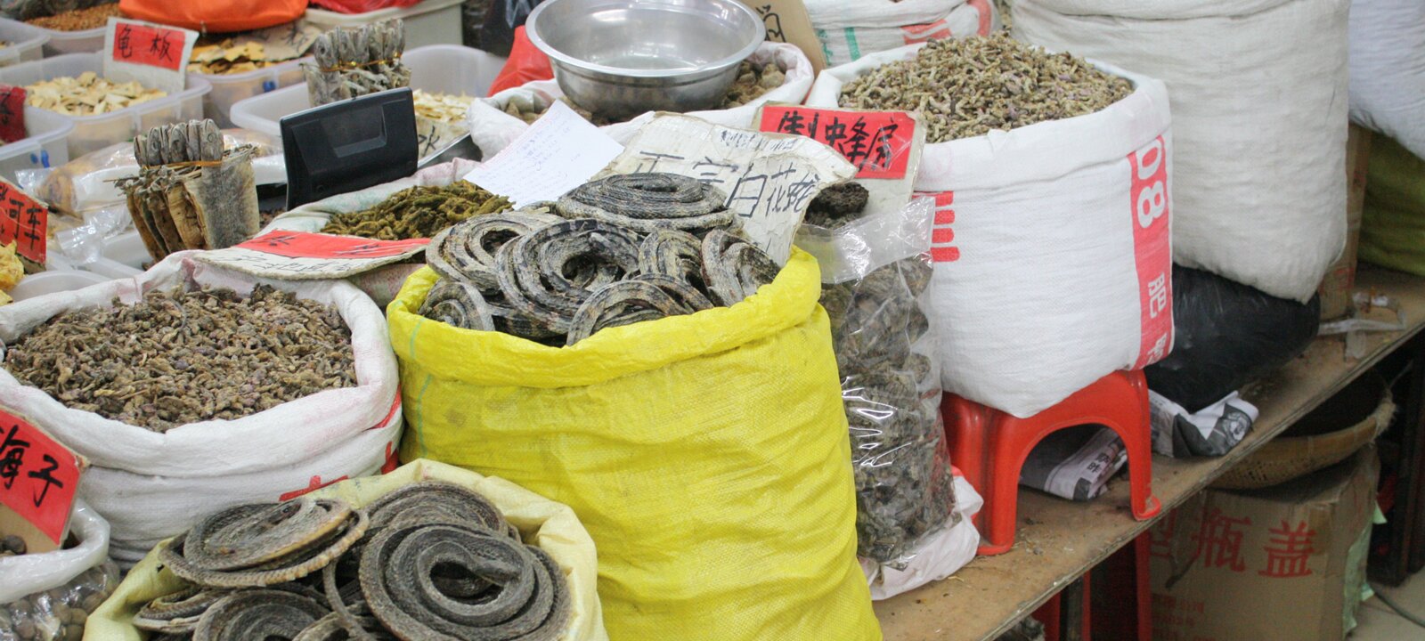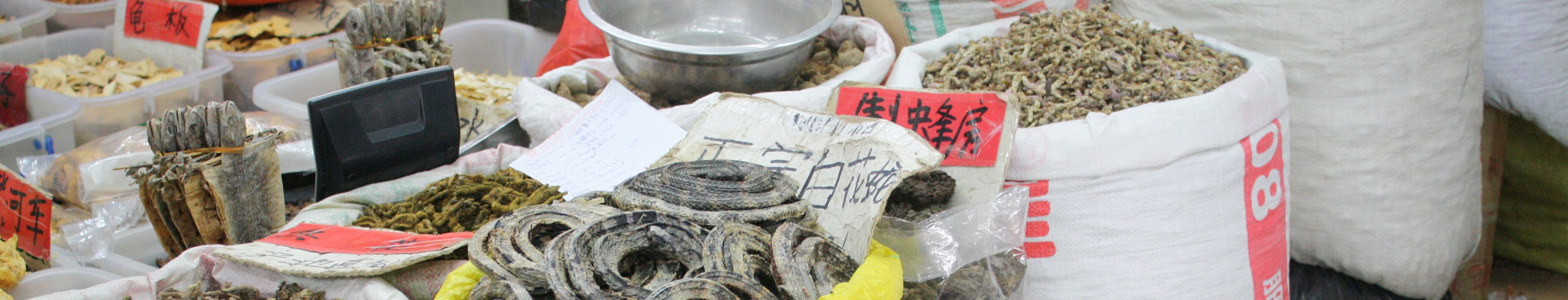 Turtle shells. Snake skins. Snakes. Qingping market is one of the largest traditional markets/pharmacies in China. Frogs and crabs. Orchard gardenShamian Labels