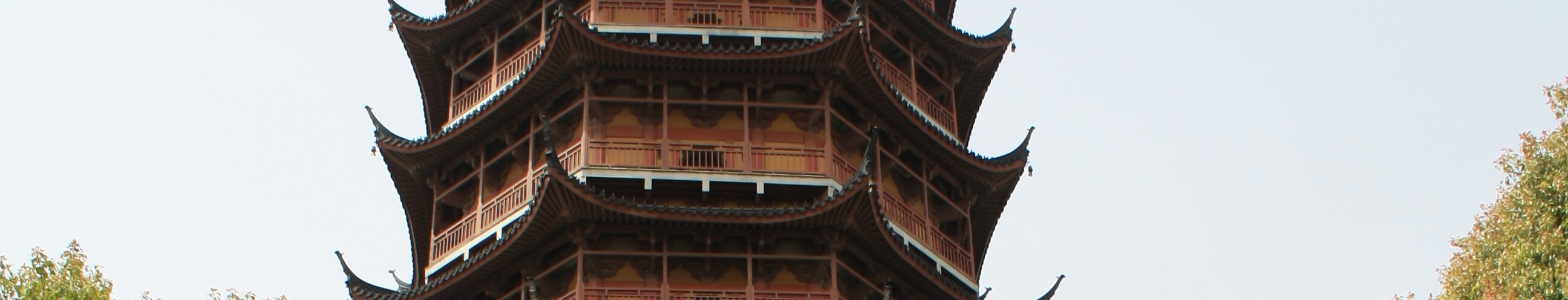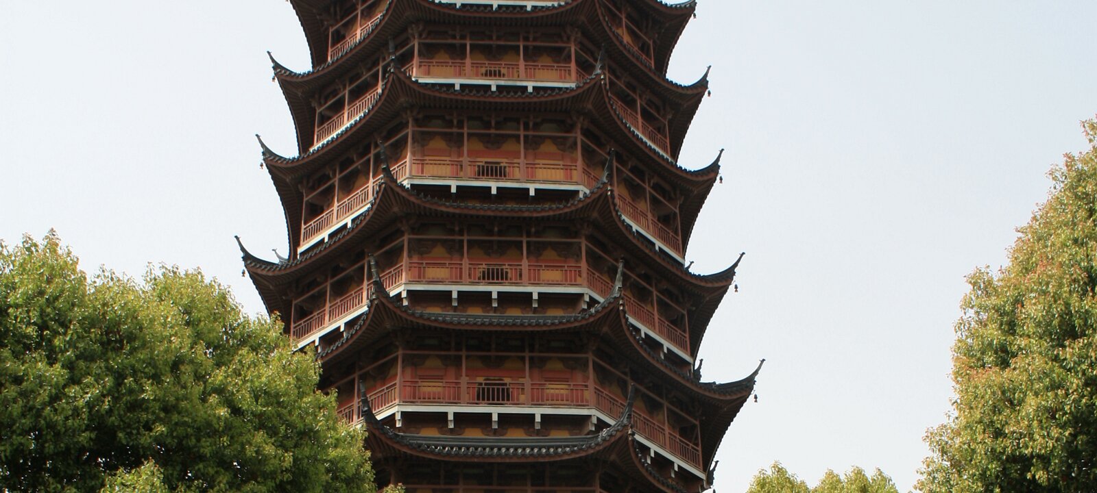 The Northern temple pagoda, founded in the 3rd century AD (rebuilt thereafter), 76m high. Ceiling in the pagoda. Lion grove garden Labels