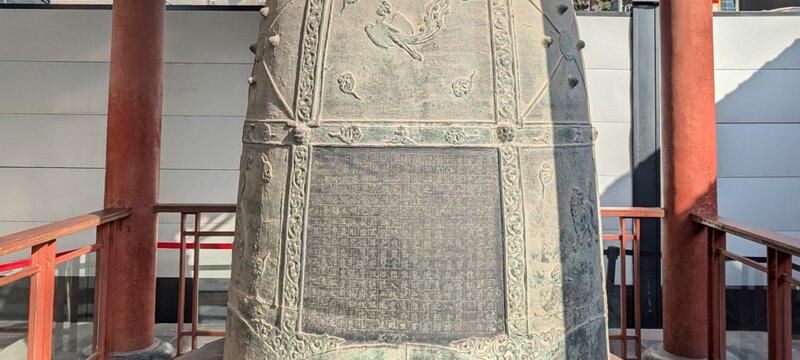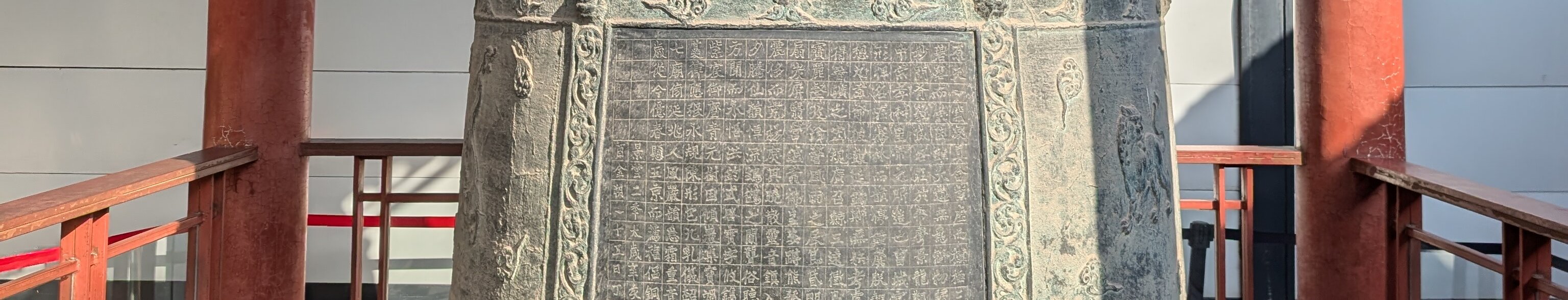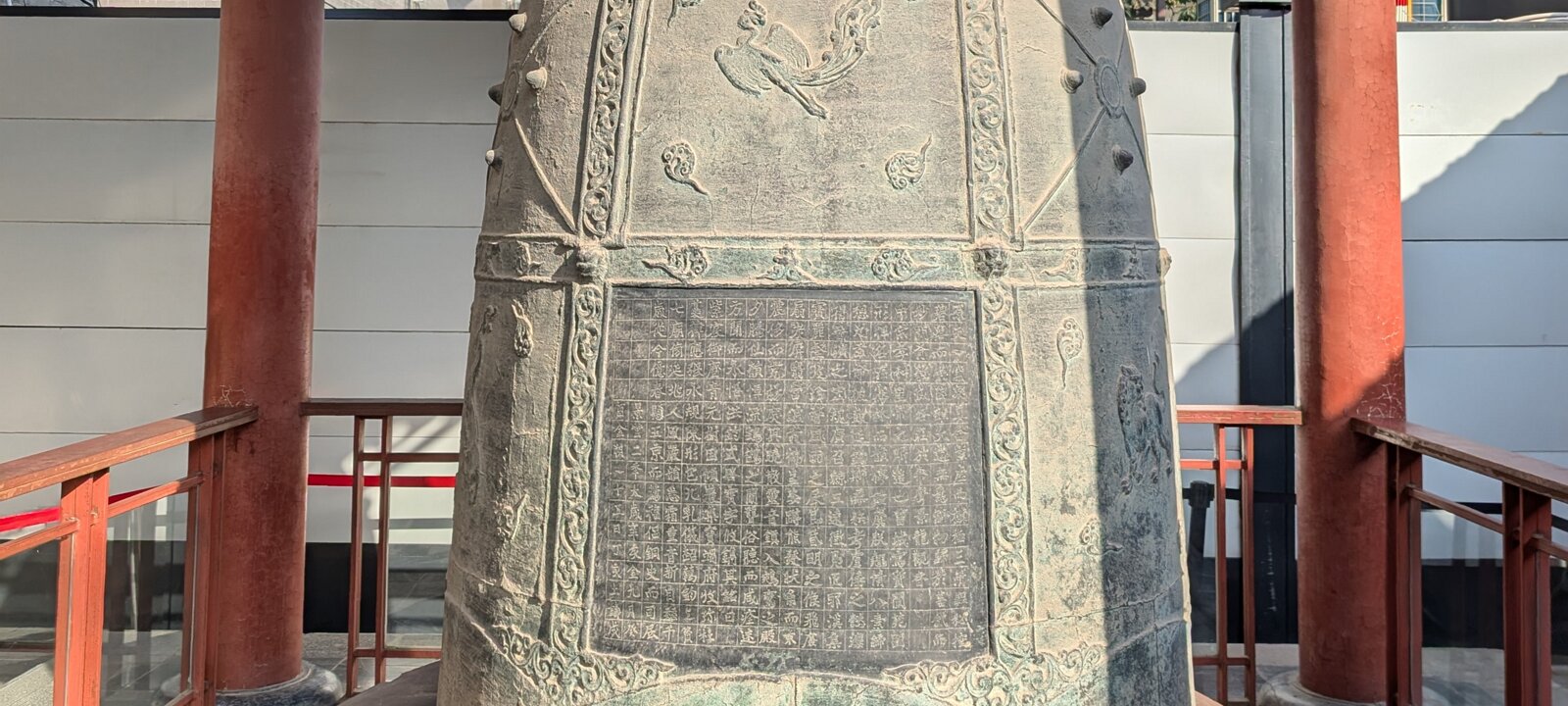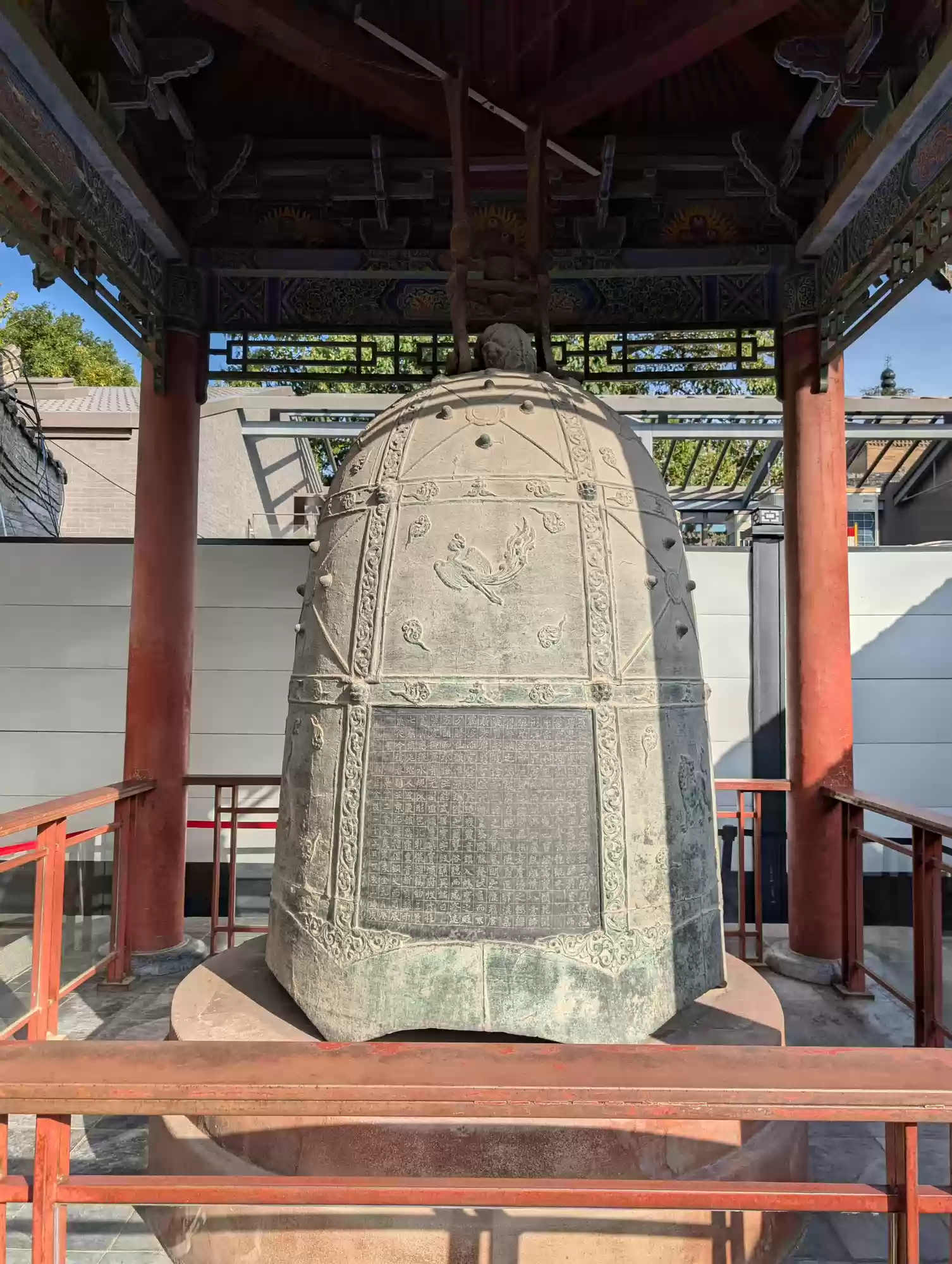 Belin temple. Jingyun bell, cast in 711 (Tang), 6 tons, engraved with a text by Emperor Li Dan. Jingyun bell, cast in 711 (Tang), 6 tons, engraved with a text by Emperor Li Dan. Stele of an imperial edict, 1313. Bell Tower Labels