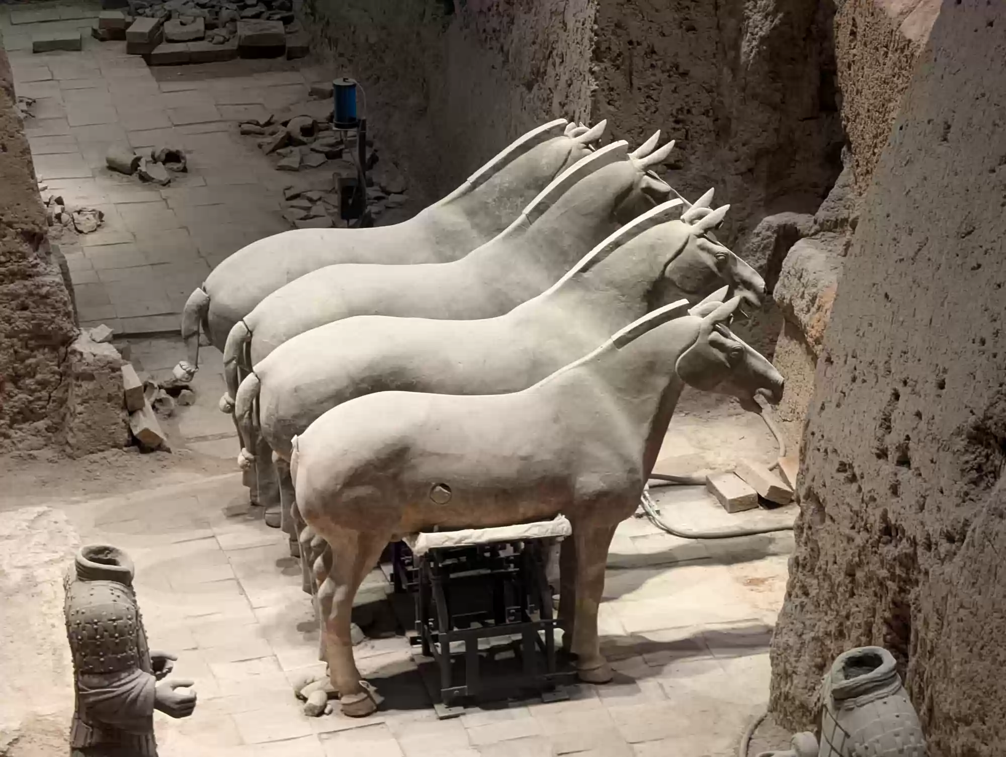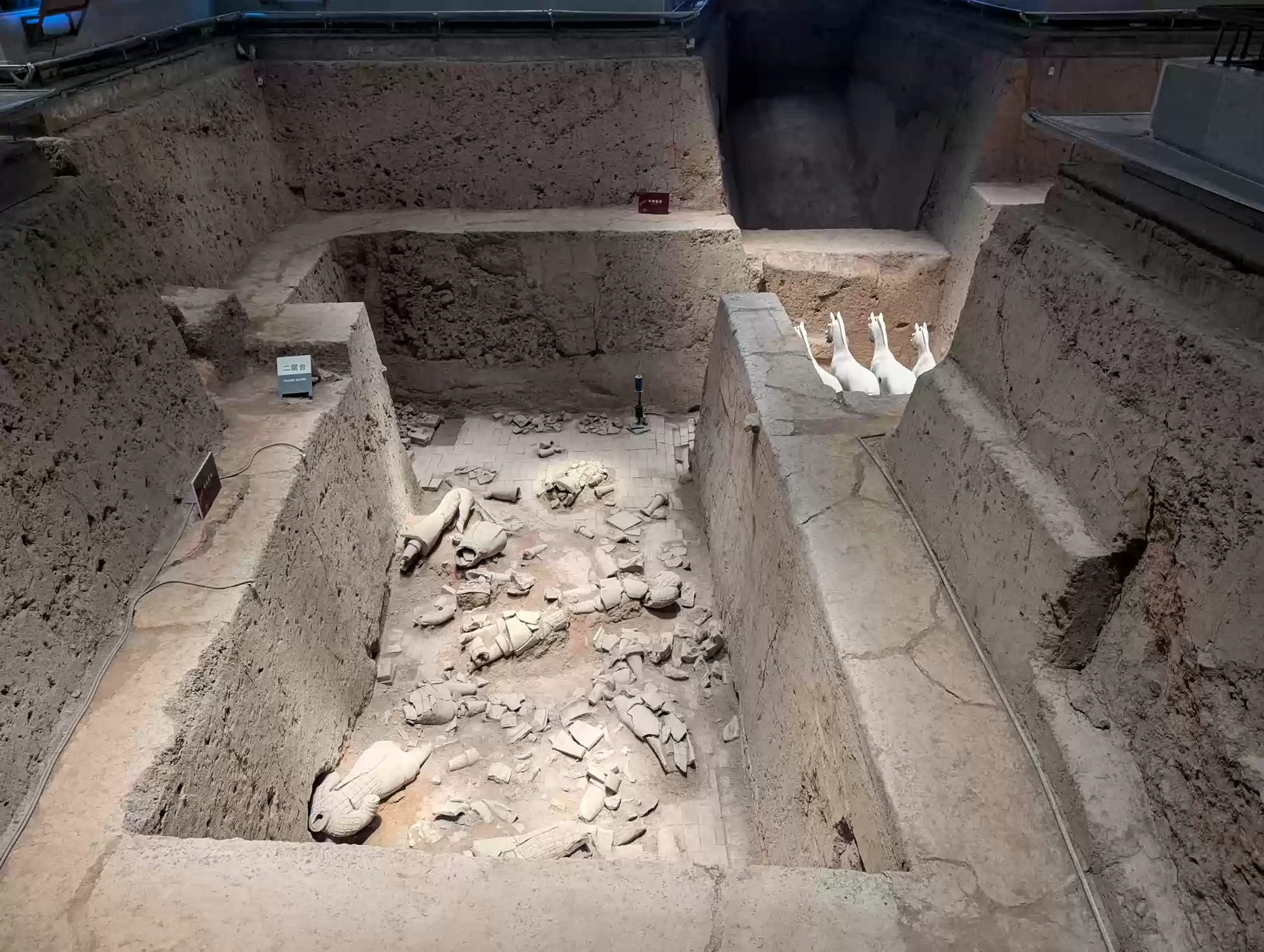 The square chariot room is in the middle of the pit, connecting the two wings. Entryway to Pit No.3 is to its east. A wooden chariot and 4 sculptures were…