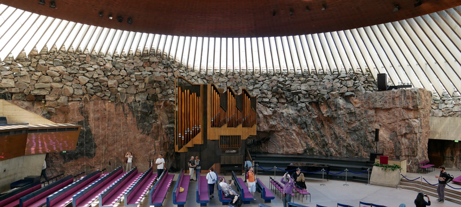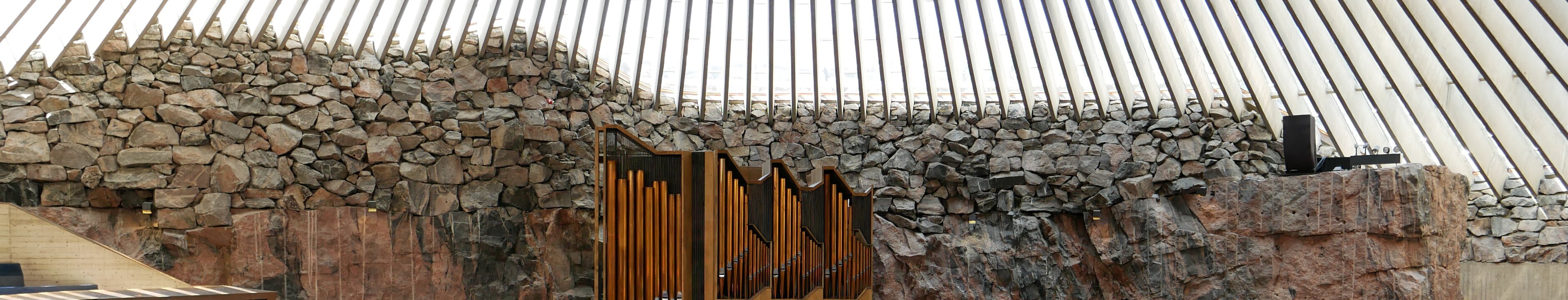 Temppeliaukio church is built directly into the bedrock. It was built by architects Timo and Tuomo Suomalainen in 1969. Top of the rock with a stone wall to protect the dome. Drilling trace remains have not been removed from the walls, and water trickling from cracking in the rock is led away along channels under the floor. The inner surface of the dome (diameter: 24m, height: 13m) is clad with a 22 km copper tape. SuomenlinnaTrain station Labels