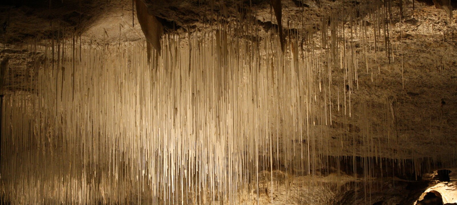 The cave of Chorange is famous for its hanging needles, which are in fact very thin and long straws. Water goes through the rock and comes out in micro-holes… The cave also features regular stalactites. Chaudes-AiguesClermont-Ferrand Labels