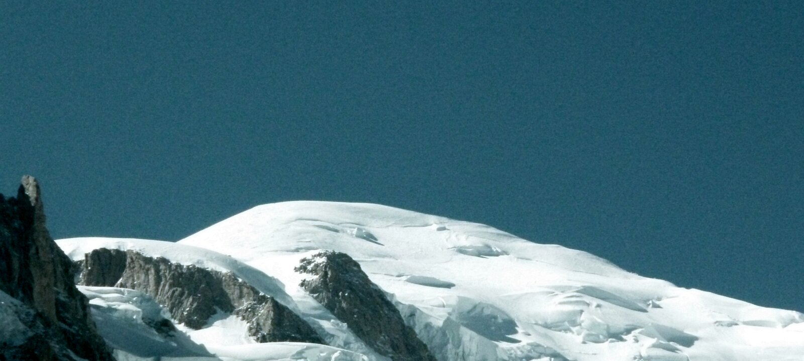 Mont-Blanc, in the background ("white mountain", 4810m) is the tallest mountain in Europe. It is located on the border between France and Italy .