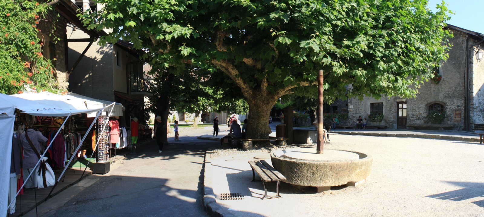 The medieval village of Yvoire, on the shore of Lake Leman. The castle of Yvoire was built between 1306 and 1311. Main square, with a large linden tree. Main square. Steeple of the church of Yvoire, bulbed as was typical in Savoy in the late19th century. It was built in 1856; the bells were cast in 1851. The cock and ball at the top of the steeple are covered with a thin layer of pure gold. The choir of the church dates back from the 14th century, while the nave was built in the 16th century. Vienne Labels