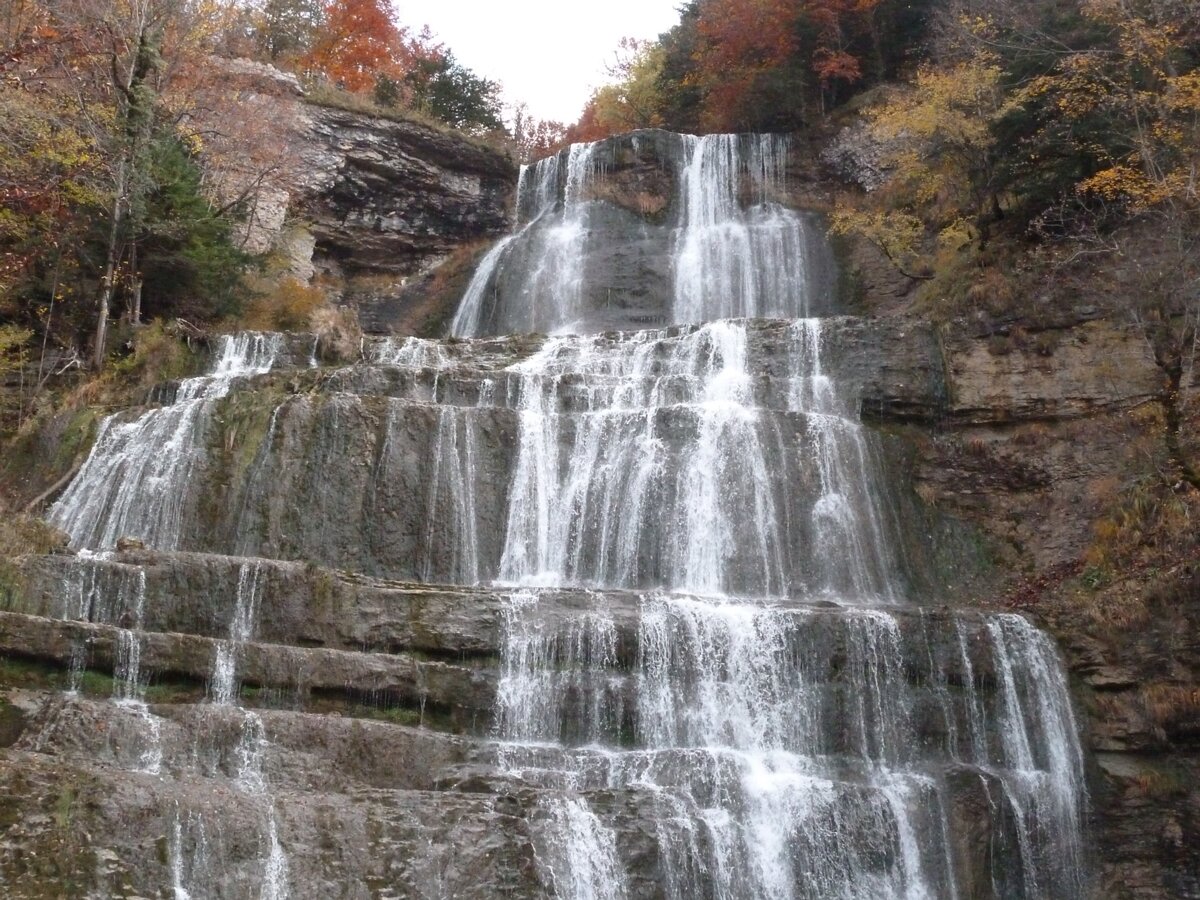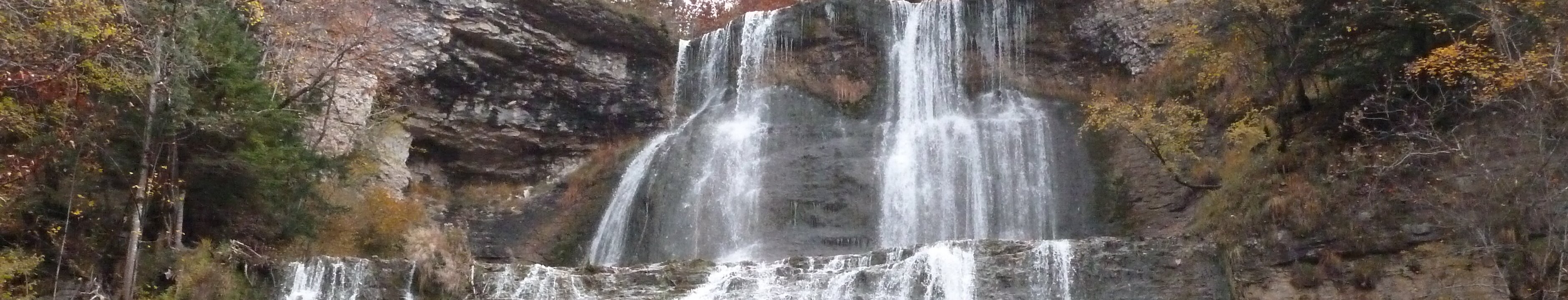 The spring of the Hérisson river are located at alt. 805m. The river then flows rapidly through a series of cascades towards a valley. Cascade de l'éventail (fan cascade), 65m high. Evergreen and decideous trees are mixed in the forest. Mouthe Labels