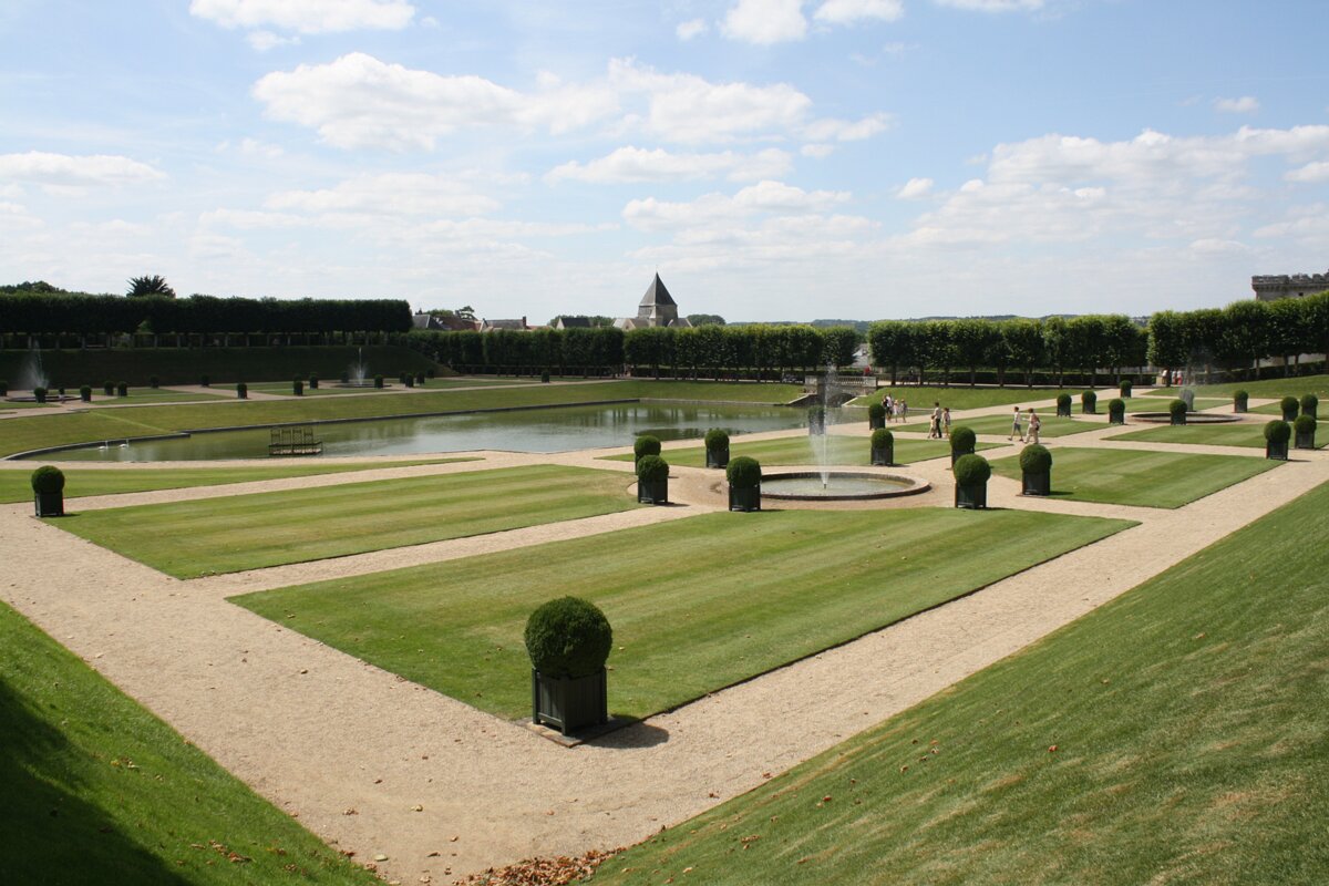 The water garden is of classical inspiration and is organized around a large Louis XV mirror-shaped pond. The garden is surrounded by a cloister of lime trees. Mirror pond. Kitchen garden Labels