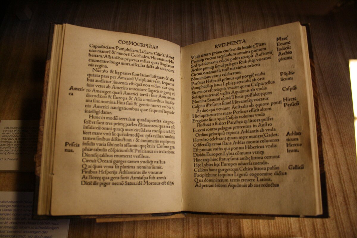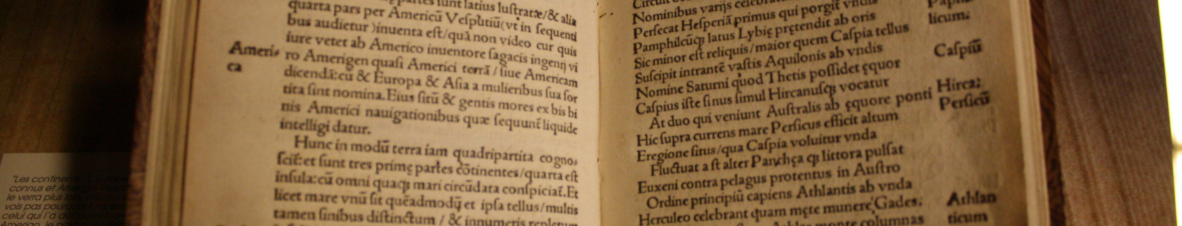 The Humanist Library, housed in a former covered market, contains many rare manuscripts and books includng 16th century printed books. Religious book, 7th century. Manuscript from the 7th century. Merovingian lectionary, manuscript on parchment, 7th century. 12th century manuscipt on parchment, Caroline minuscule script with margin annotations. Book with prayers, 12th century. Otto von Passau, The loving soul, 1430. Cursive gothic script. Saint Augustine, printed in 1468 on paper. Jakob Wimpfeling, printed in 1497 in Strasbourg on paper. Schoolbook of Beatus Rhenanus, 1498. Beatus was the founder of the library. First record of the word "America", making this book the de facto birth certificate of the "New World". Matthias Ringmann, printed in 1507. Gospel book, J. Geiler von Kaysesberg. printed in 1515. Claude Ptolemy (100-170 CE), book printed in Strasbourg on paper in 1520. Charles V's letter making Beatus a nobleman, 18 August 1523. Martin Luther, Bible, 1549. Sainte-Foy church Labels