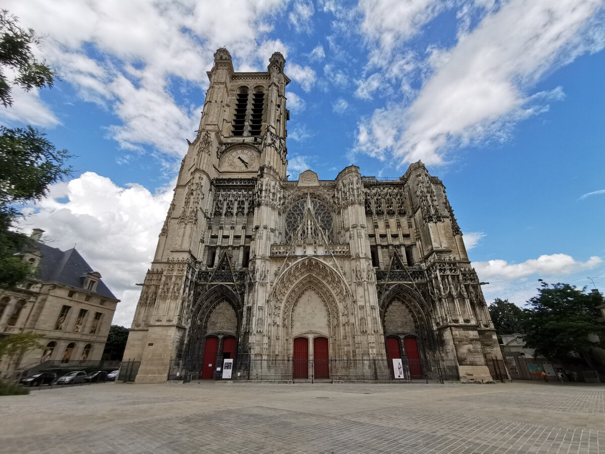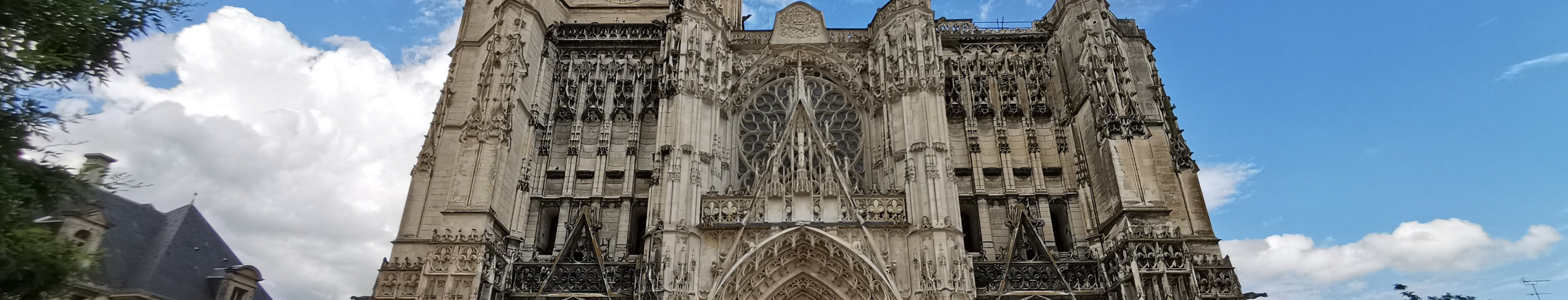 Saint Peter and Saint Paul cathedral, 13-17th centuries. The facade was built in the early 16th century, until 1554. The north tower was completed in 1634 and the south tower was never completed. North transept (left). The choir was built in the early 13th century, making the cathedral one of the oldest gothic cathedrals. Stained glass windows, 14th century. Stained glass windows, 14th century. Stained glass windows, 14th century. North transept and rose (1408). South transept, rebuilt in the mid-19th century. South transept, rebuilt in the mid-19th century. The choir stained glass windows are from the 13th century. Choir stained glass windows, 13th century. Choir stained glass windows, 13th century. Champeaux street Labels