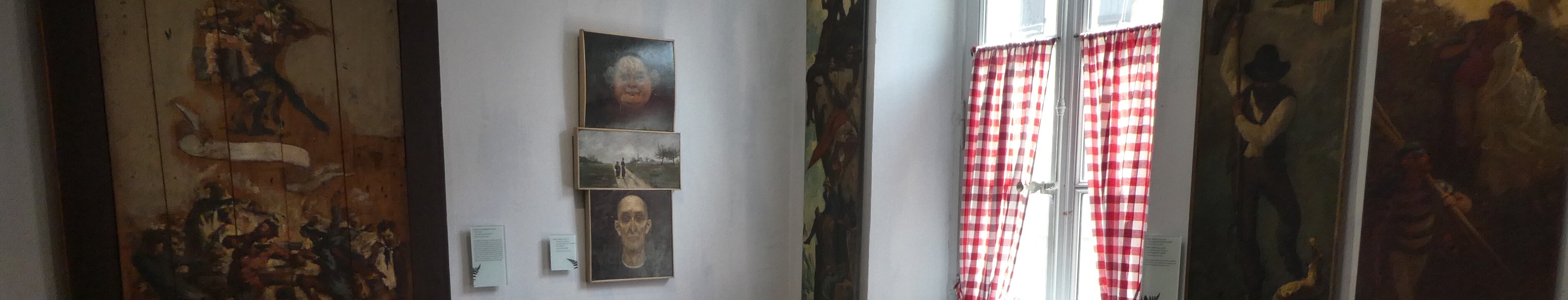 Auberge Ganne, where many artists lived or ate between 1820 and 1860, now a museum. Grocery, inside the inn. Tenant's bedroom. Tenant's bedroom. Officers' room. Officers' room. Paintings found while refurbishing the house to turn it into a museum. Siron inn sign, mid 19th century. Millet. Chaigneau (1830-1906), rural scenes. Chaigneau (1830-1906), farm. Theodore Rousseau (1812-1867), rural home. Georges Gassies (1829-1919), Moreau rock at sunset. Labels