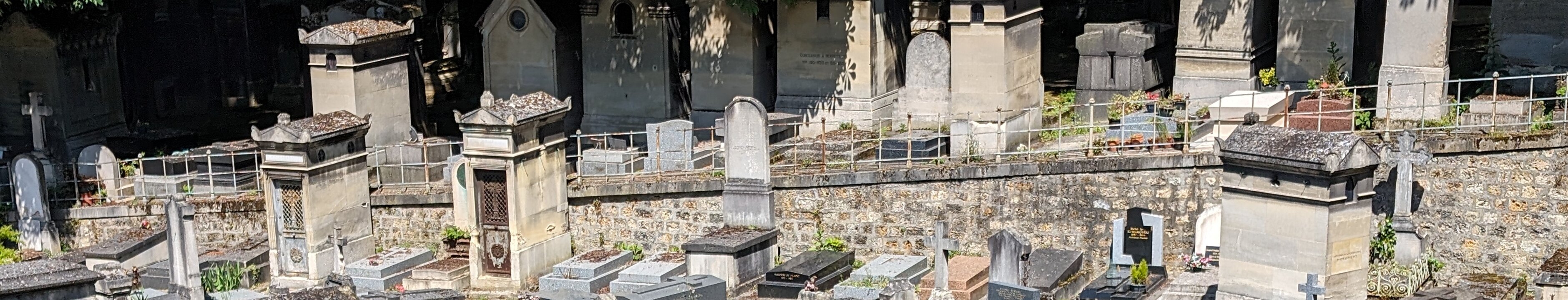 The cemetery of Montmartre was created in 1825. It holds 21500 tombs. Leon Foucault. Adolphe Sax. Degas family. Alexandre Dumas, fils. Michel Berger and France Gall. Michel Galabru. Edmond and Jules de Goncourt. Stendhal. André Marie Ampère. La Goulue. Hector Berlioz. Labels