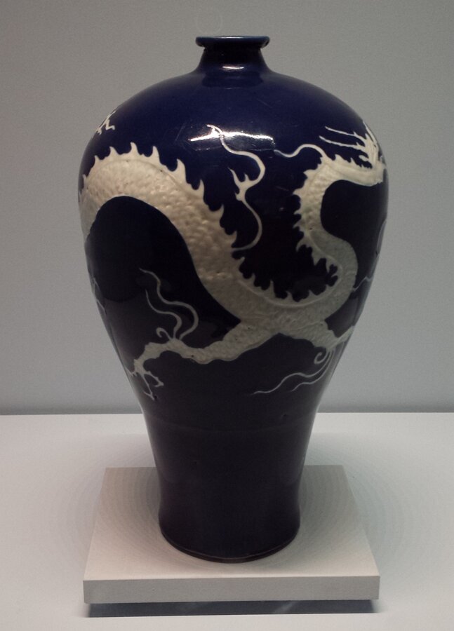 Meiping vase with dragon decor, Jingdezhen kilns (Jiangxi), Yuan dynasty (1279-1368). Porcelain, relief and reserved decoration on a cobalt blue ground under…