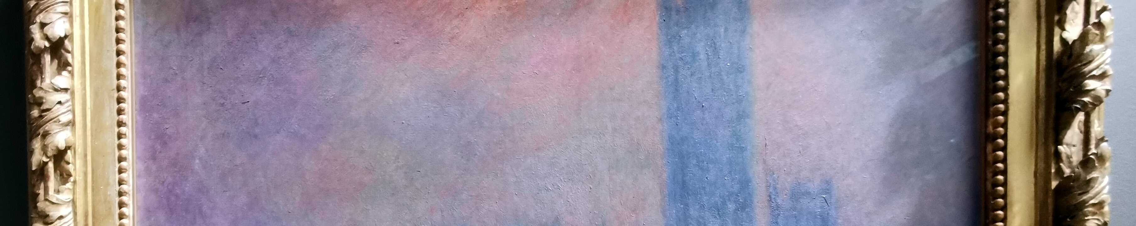 Claude Monet, Luncheon on the grass, 1865-1866, left unfinished (an attempt to outperform Manet). Claude Monet, Madame Louis Joachim Gaudibert, 1868. Claude Monet, The magpie, 1868-1869. Claude Monet, Madame Monet on a sofa, ca. 1871. Monet, Rouen cathedral. Claude Monet, Inside an apartment, 1875. Pierre-Auguste Renoir, Portrait of Claude Monet, 1875. Claude Monet, Saint-Lazare station, 1877. Claude Monet, Camille on her deathbed, 1879. Camille Monet was Claude's wife. Claude Monet, Ice melting on the Seine river, 1880. Claude Monet, Villas in Bordighera, 1884. Claude Monet, Water lillies, pink harmony, 1900. Claude Monet, London, the Houses of Parliament, Sunlight Opening in Fog, 1904. ManetVan Gogh Labels