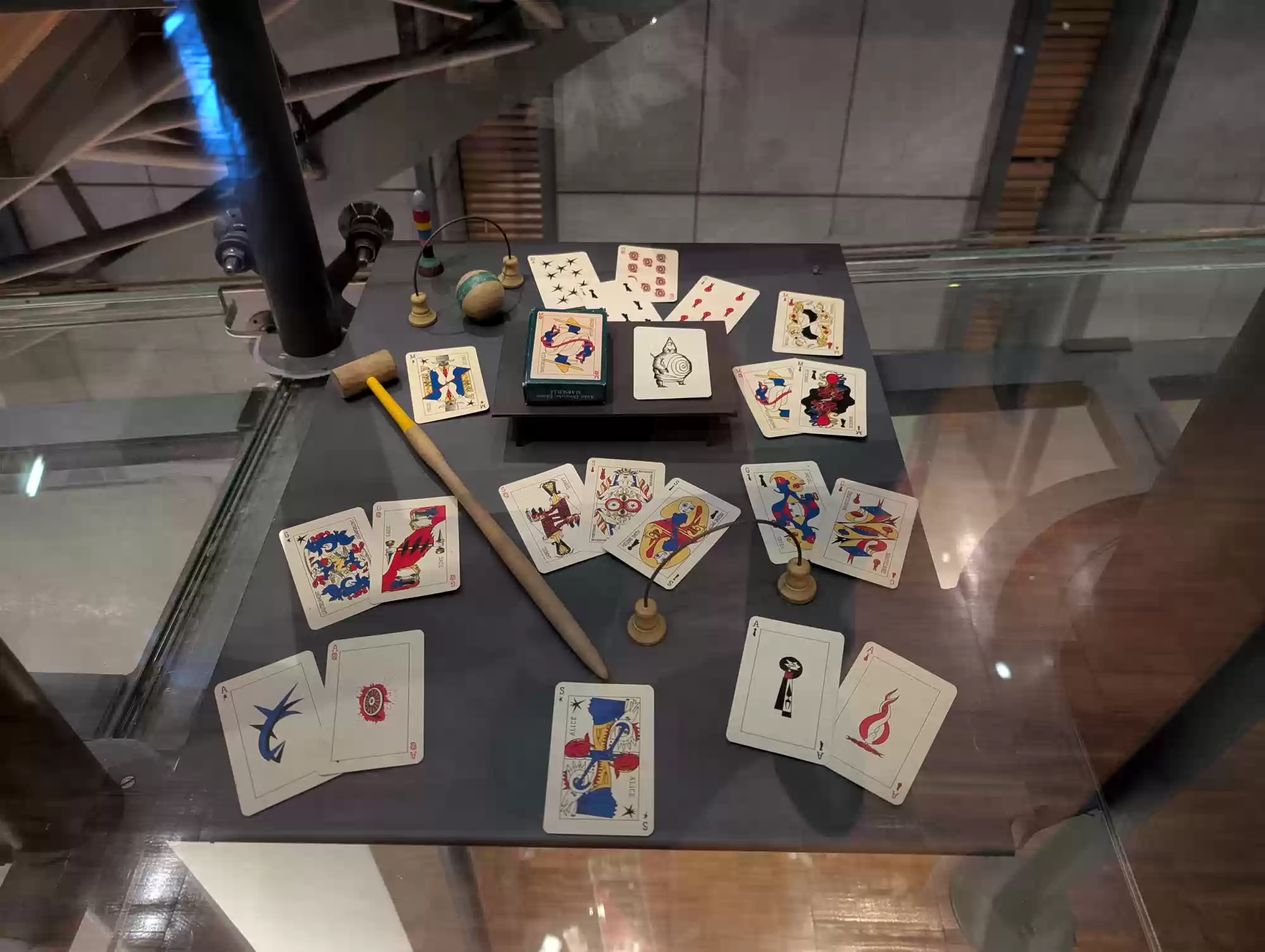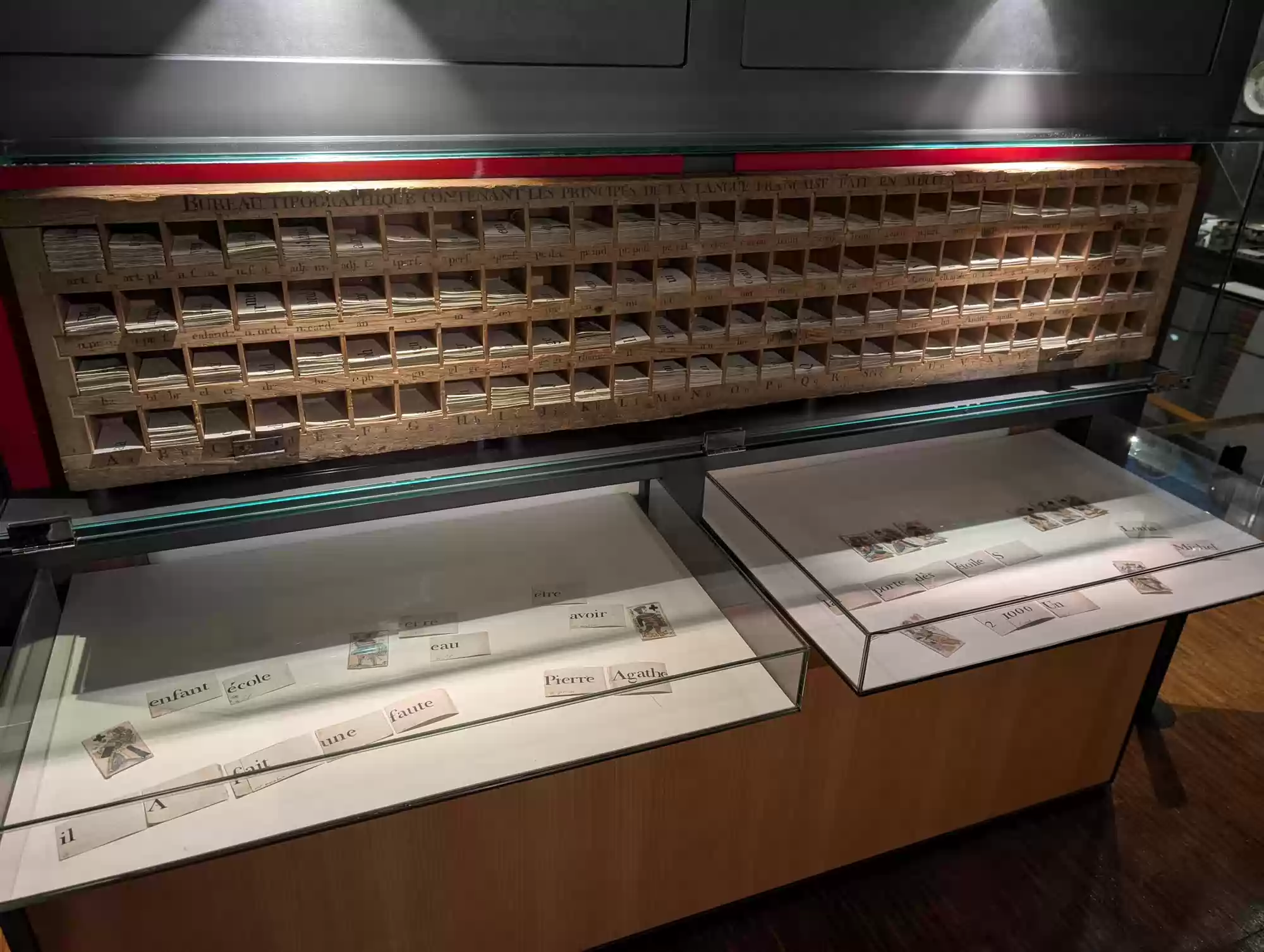 Tipographic desk. Players may compose words and sentences using cards with pre-written syllables.