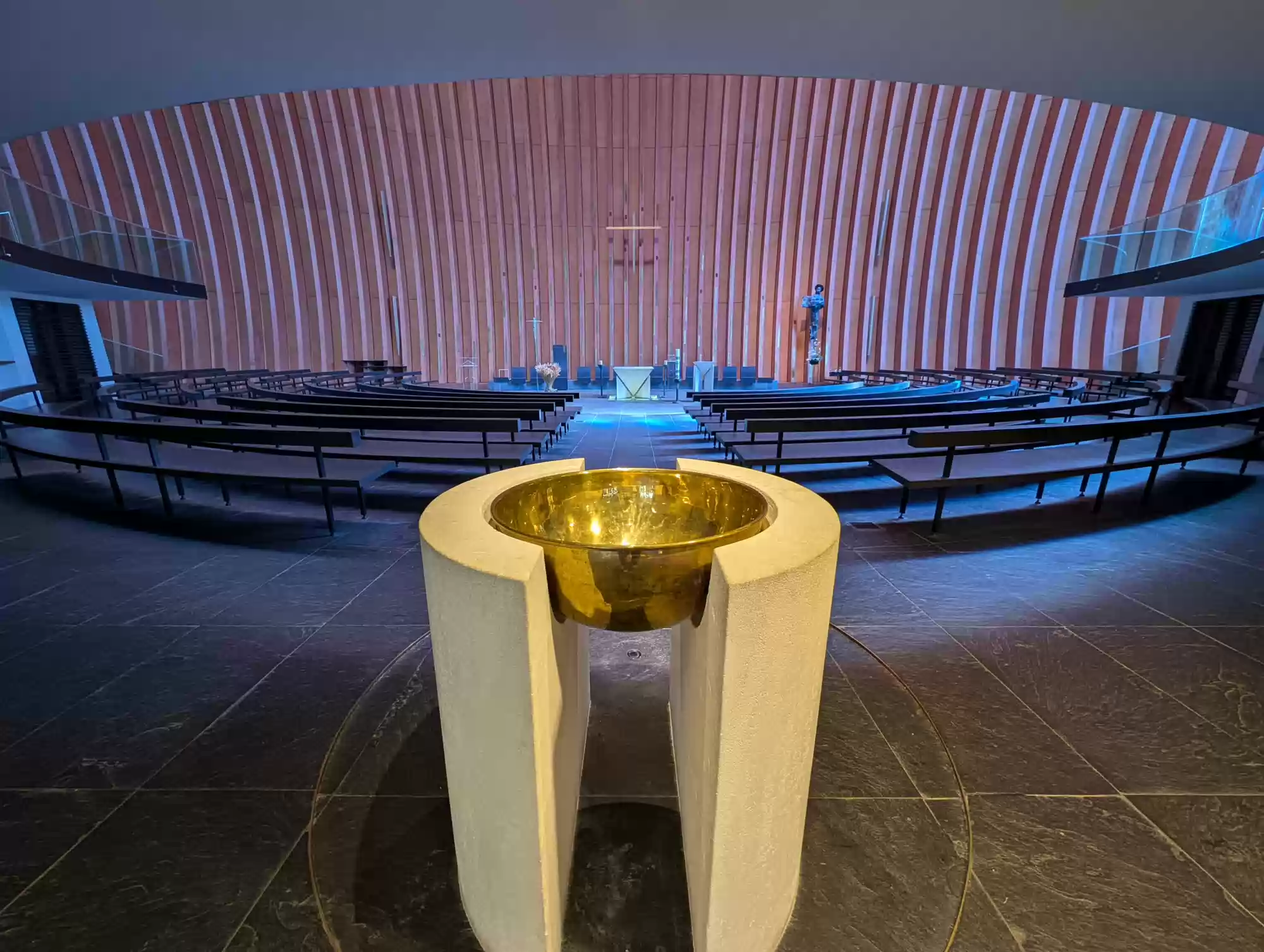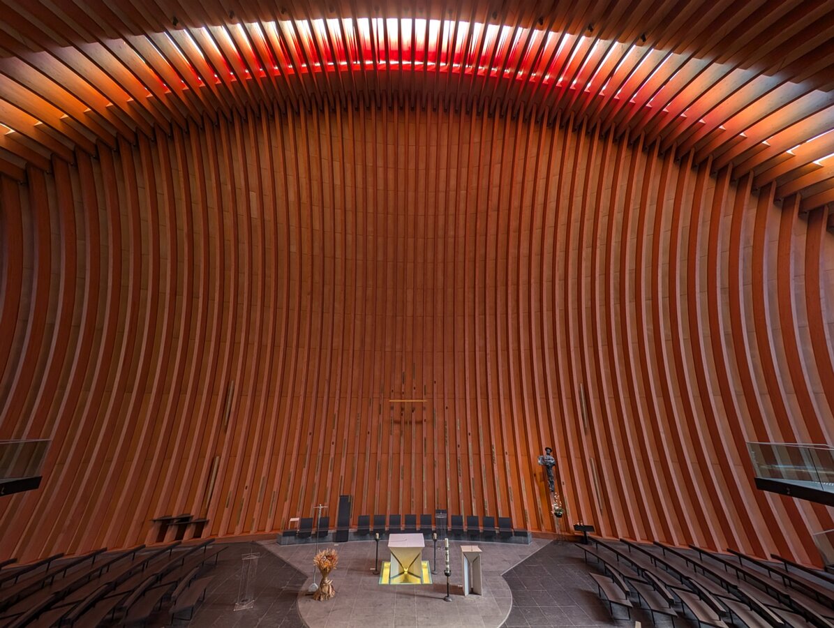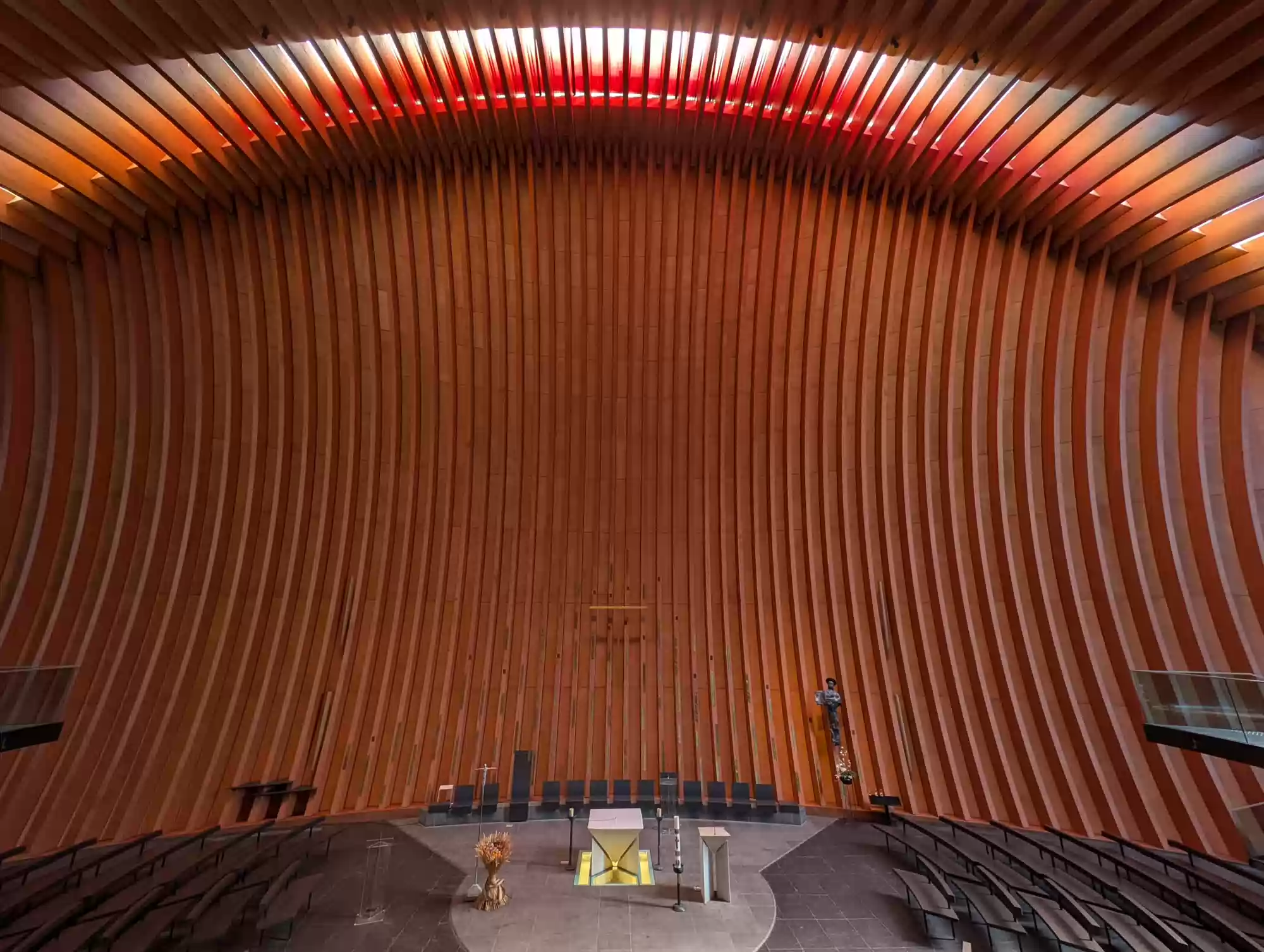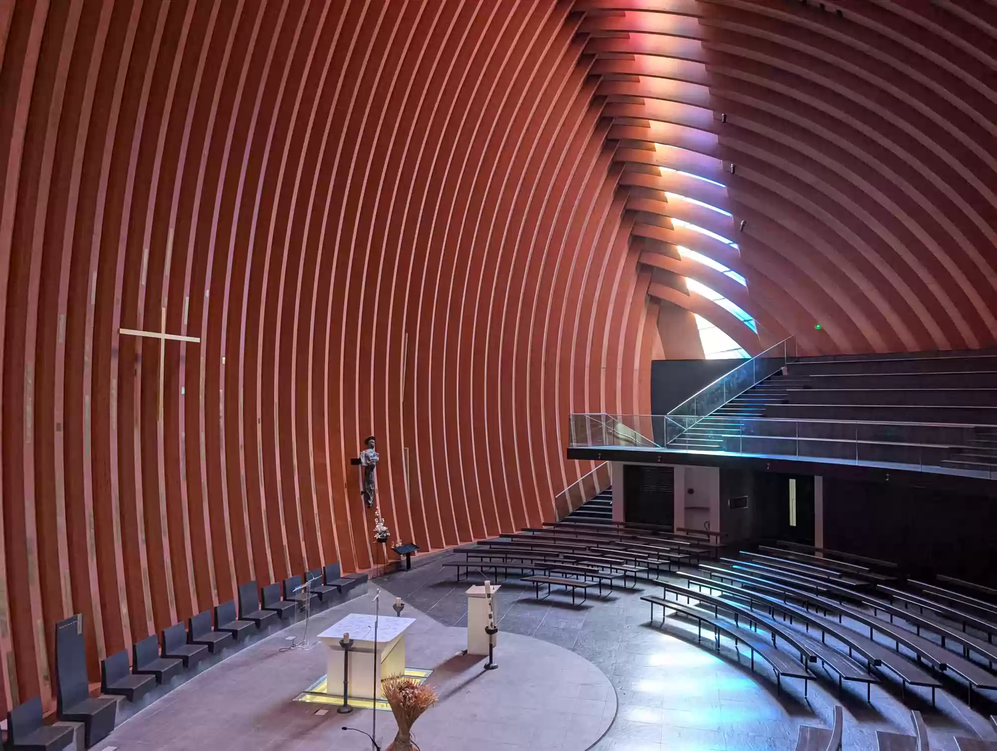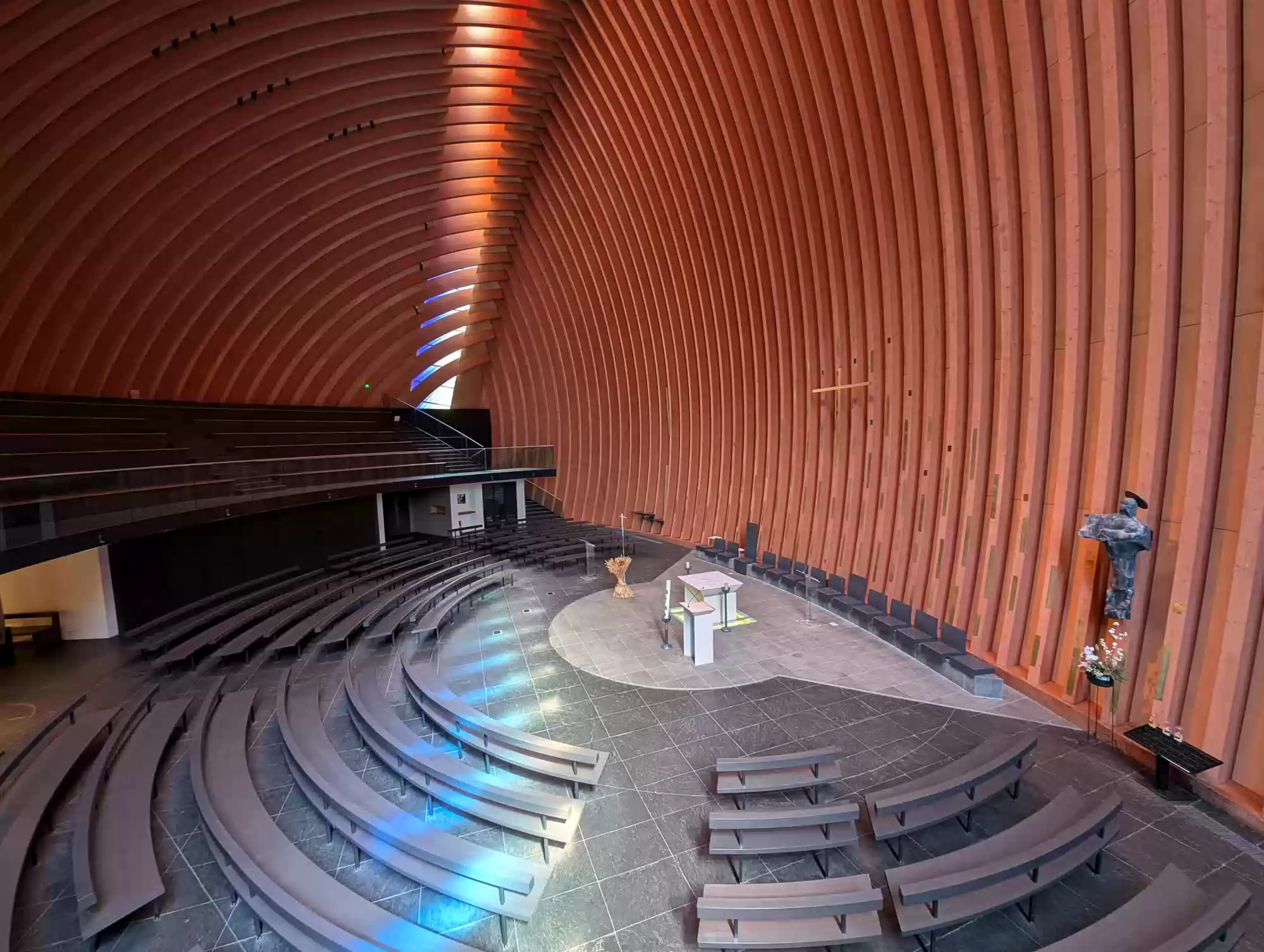 Cathedral built in 2015, replacing the previous 1976 church (then cathedral in 1987). Steeple. Wooden shell. Wooden shell. Wooden shell. Labels