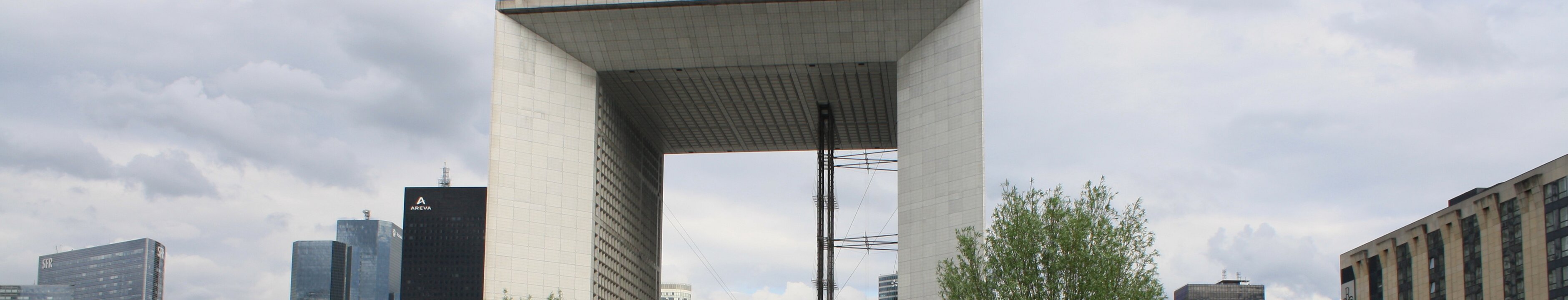 La Defense is a modern business district just outside Paris, featuring steel-and-glass towers and the "Grande Arche" (great arch).