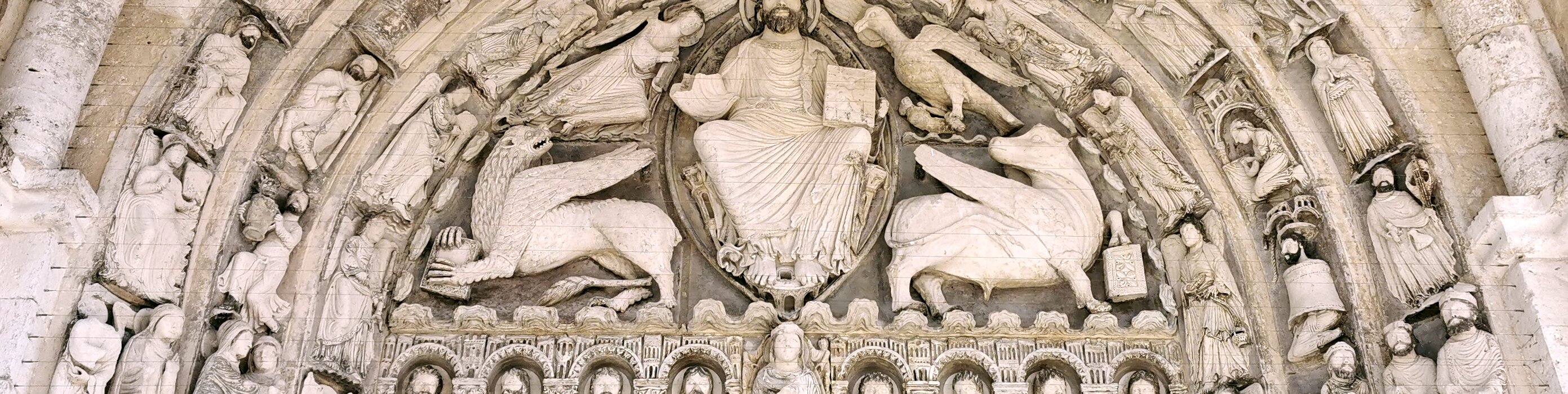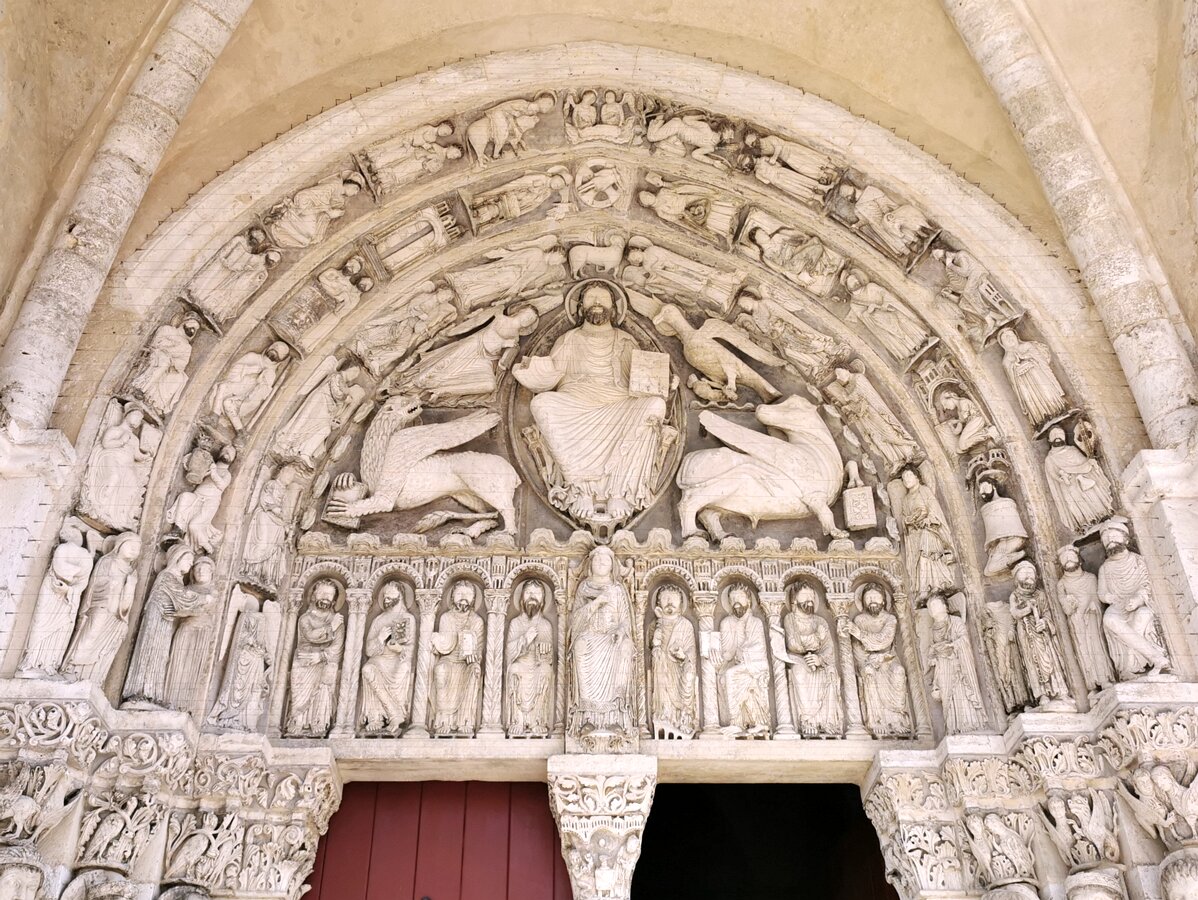 Former priory church, 12th century, dedicated to Saint Loup of Sens. Tympanum: Christ and symbols of the evangelists. Arches: life and miracles of Saint Loup. Column statue between the doors: Saint Loup. Tympanum: Christ and symbols of the evangelists. Arches: life and miracles of Saint Loup. Life and miracles of Saint Loup. Life and miracles of Saint Loup. Life and miracles of Saint Loup. Altarpiece. Walnut wood statue, 19th century. Noyen-sur-SeineCaesar tower Labels