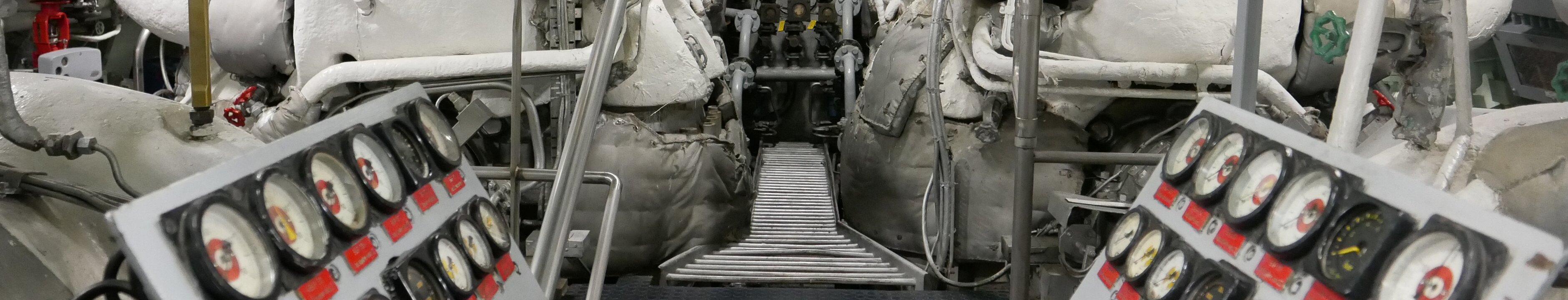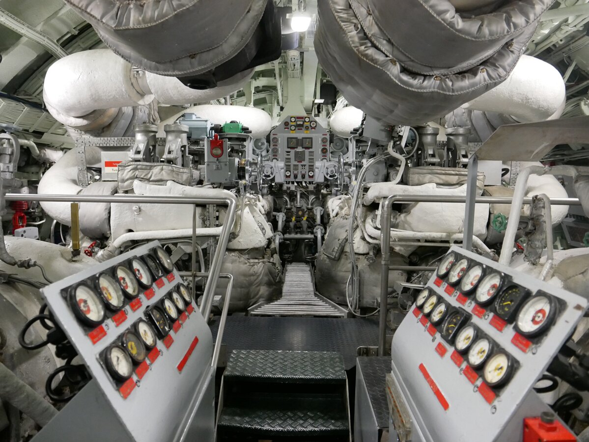 Redoutable submarine, the first French nuclear-powered submarine, launched in 1967, used for 21 years. 128 m long, 10.6 m wide, 8000 tons. Double hull. Rudder jack. Reduction gear located between the steam engine and the propulsian gear. Steam production section. Steam production section. Heat was produced by a nuclear power plant, which was removed from the submarine after decommissioning. Alternator. Oxygen control plant. Oxygen and drinkable water were produced out of sea water. Periscope. Missile tube. The Redoutable carried 16 sea-to-ground missiles with a range of more than 2000 km. Missile tube. The Redoutable carried 16 sea-to-ground missiles with a range of more than 2000 km. The 16 missile tubes. Labels