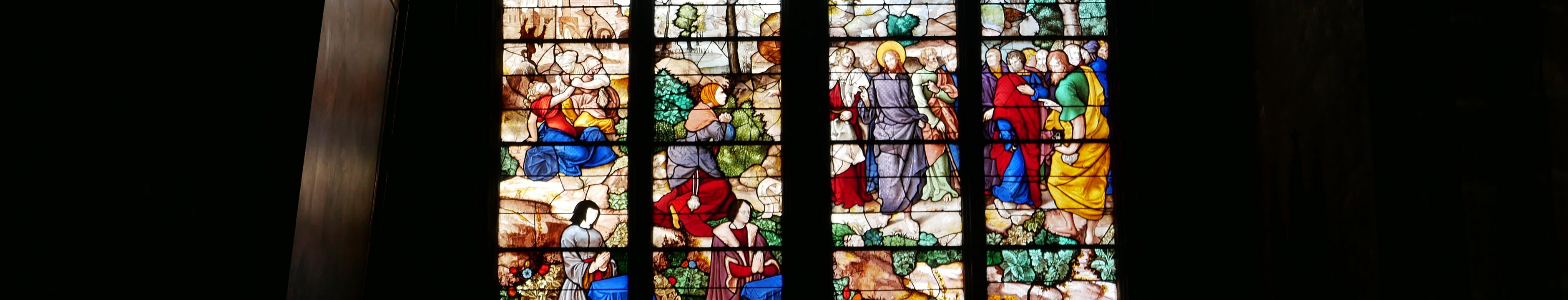 Cloister6 images Bayonne cathedral, 13-14th centuries, gothic. Bayonne cathedral, 13-14th centuries, gothic. Choir furniture, by Dominique Kaeppelin, 2003. Chapel. Canaanite stained-glass window, 1531, Renaissance. Healing of a daughter of a canaanite man by Jesus. Petit Bayonne Labels