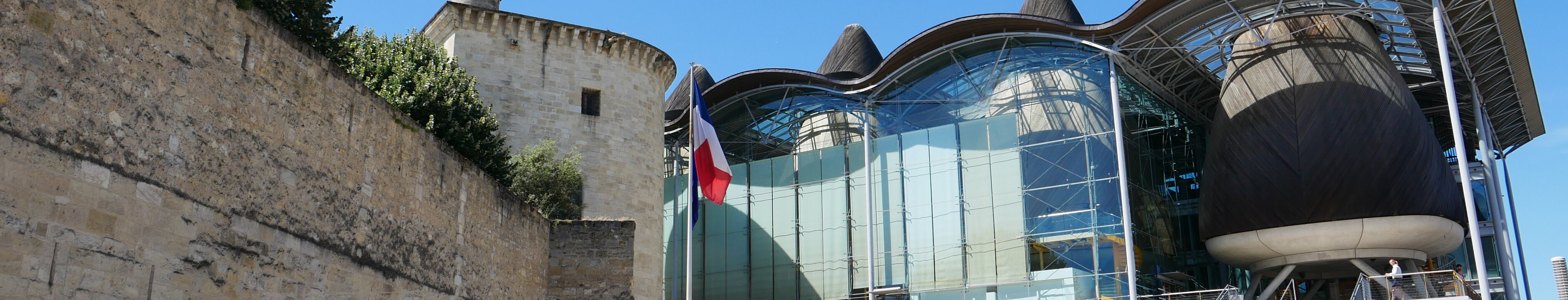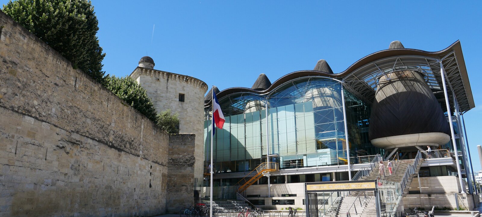 Justice court, built in 1998, next to the Ha fortress built in the second half of the 15th century after the hundred years war. Ha fort (left) and court of justice (right). Ha fort. Cathedral and Ha fort. Cathedral and Ha fort. Judges school and Ha fort. Courtrooms. Courtrooms. Courtroom. Cité du vinPalais Rohan Labels