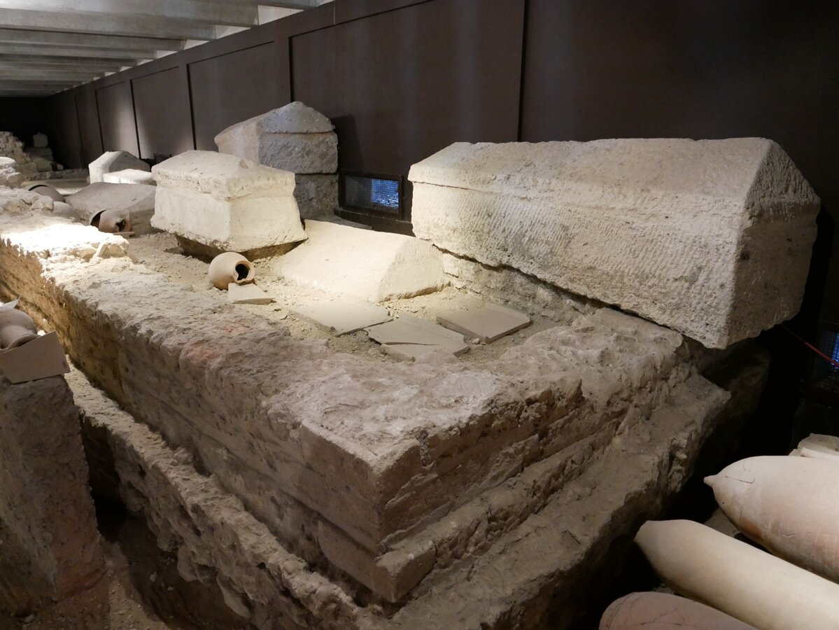 Paleochristian cemetery in the crypt of the church. 150 tombs were discovered. Foundation of a 4th-5th century building, maybe a church.