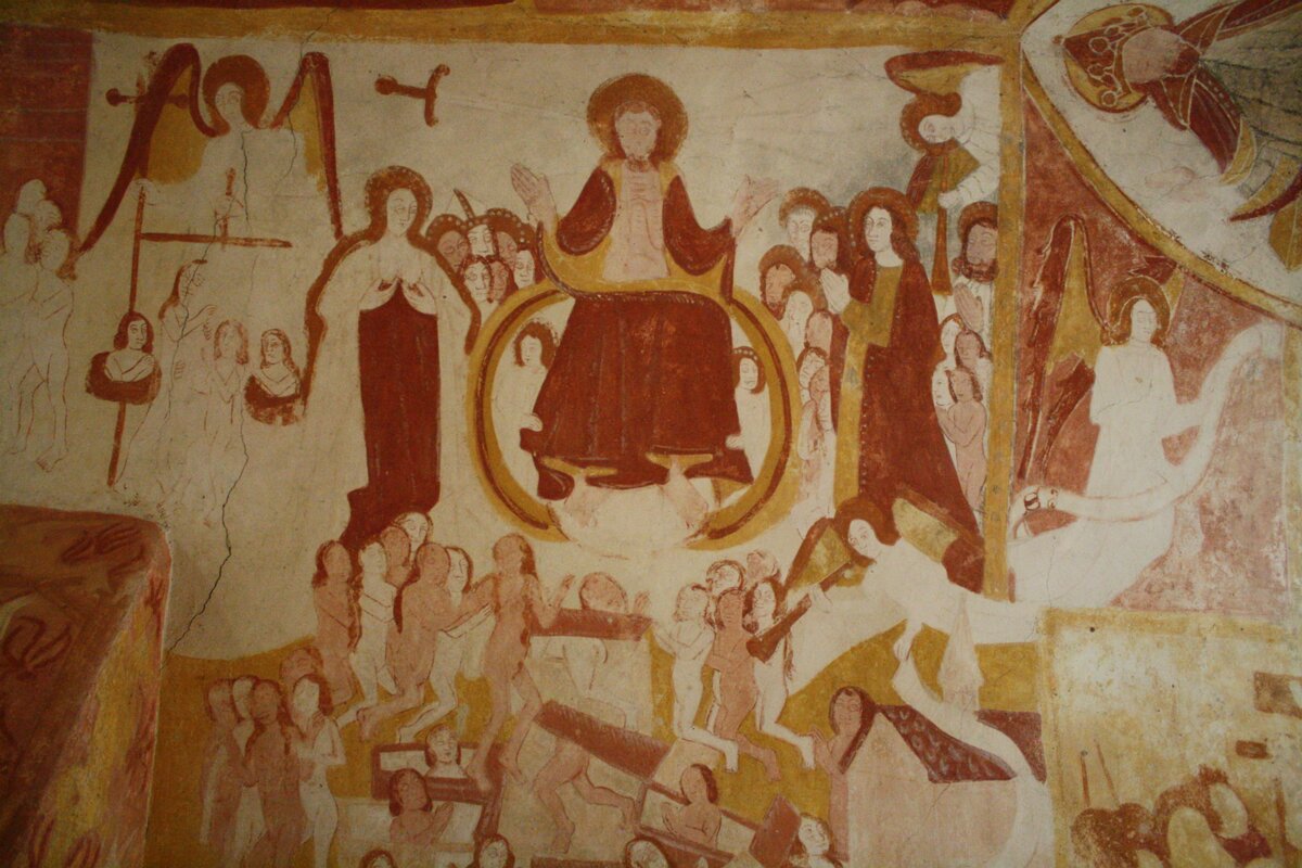 Notre Dame church, mainly romanesque, possibly built in 1184 (gothic steeple, 13th century). Notre Dame church, mainly romanesque. The shelter on the right side was added in the 18th century as a place for public gatherings. Wall paintings, mainly from the 14th century. Wall paintings, mainly from the 14th century. Wall paintings, mainly from the 14th century. Entombment of Christ. Wall paintings, mainly from the 14th century. Wall paintings, mainly from the 14th century. Choir, 15th century. Wall paintings, late 15th century. Wall paintings, late 15th century. Wall paintings, late 15th century. Wall paintings, late 15th century. Last judgment. Jesus carrying his cross. Scenes from the life of Jesus. The last supper. Lantern of the dead, 13th century. The lanterns were installed in cemeteries; a light was set at the top of of lantern. Lantern of the dead, 13th century. The lanterns were installed in cemeteries; a light was set at the top of of lantern. Labels
