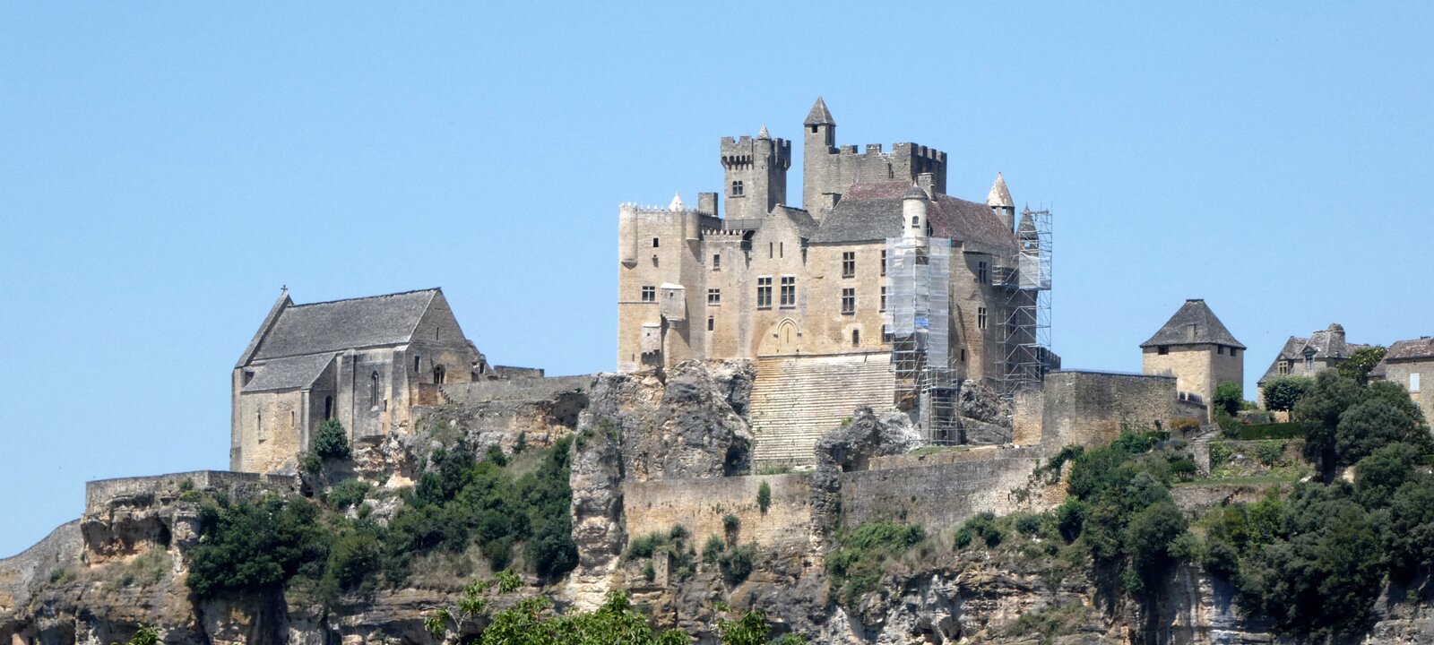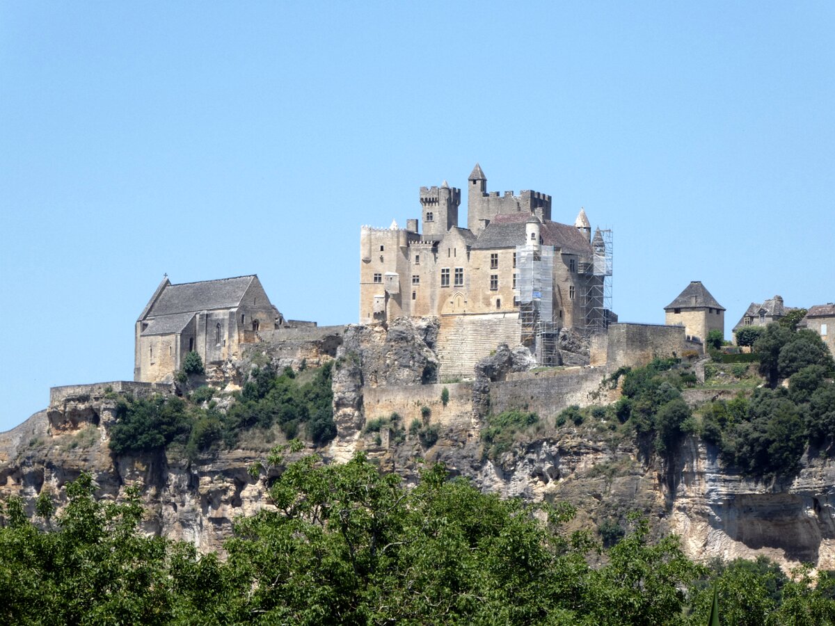 Beynac castle, essentially from the 12th century, 150 meters above river Dordogne. Oratory, 14th century, frescoes from the 15th century: the last supper. Labels