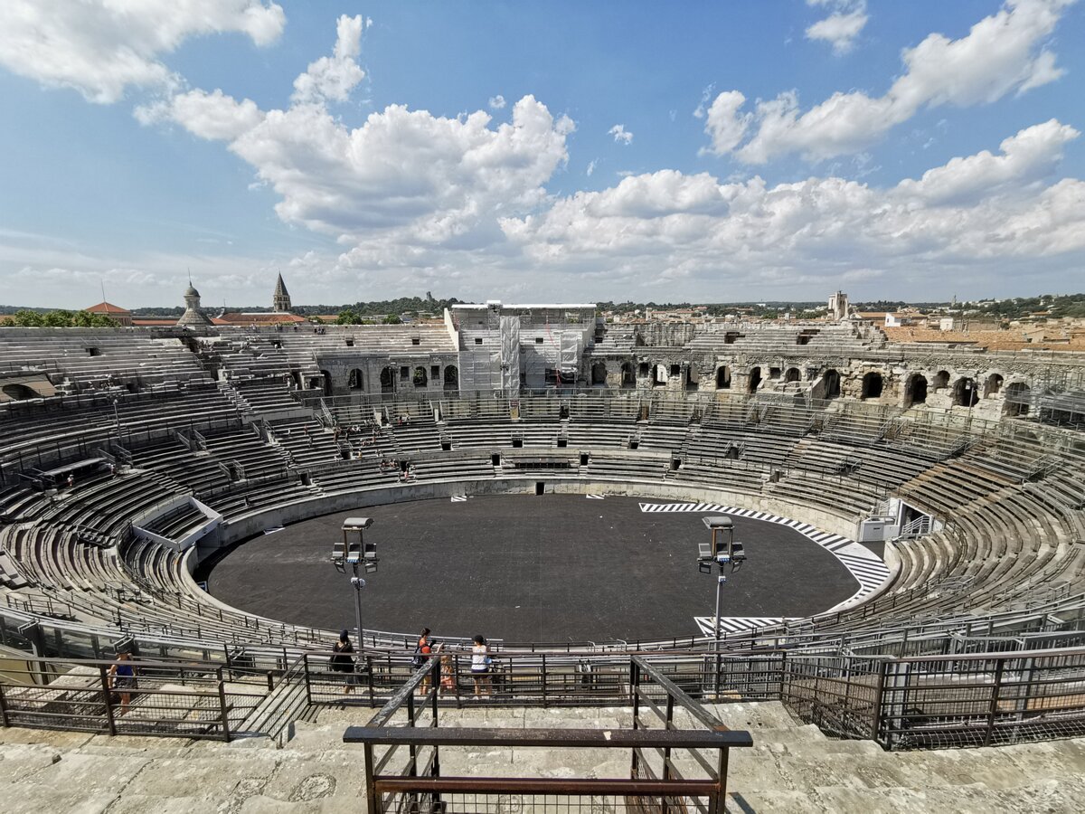 Nimes arena, 90-120 AD, 133x101x21 meters (external), 69x38 meters (arena). La Fontaine gardens Labels