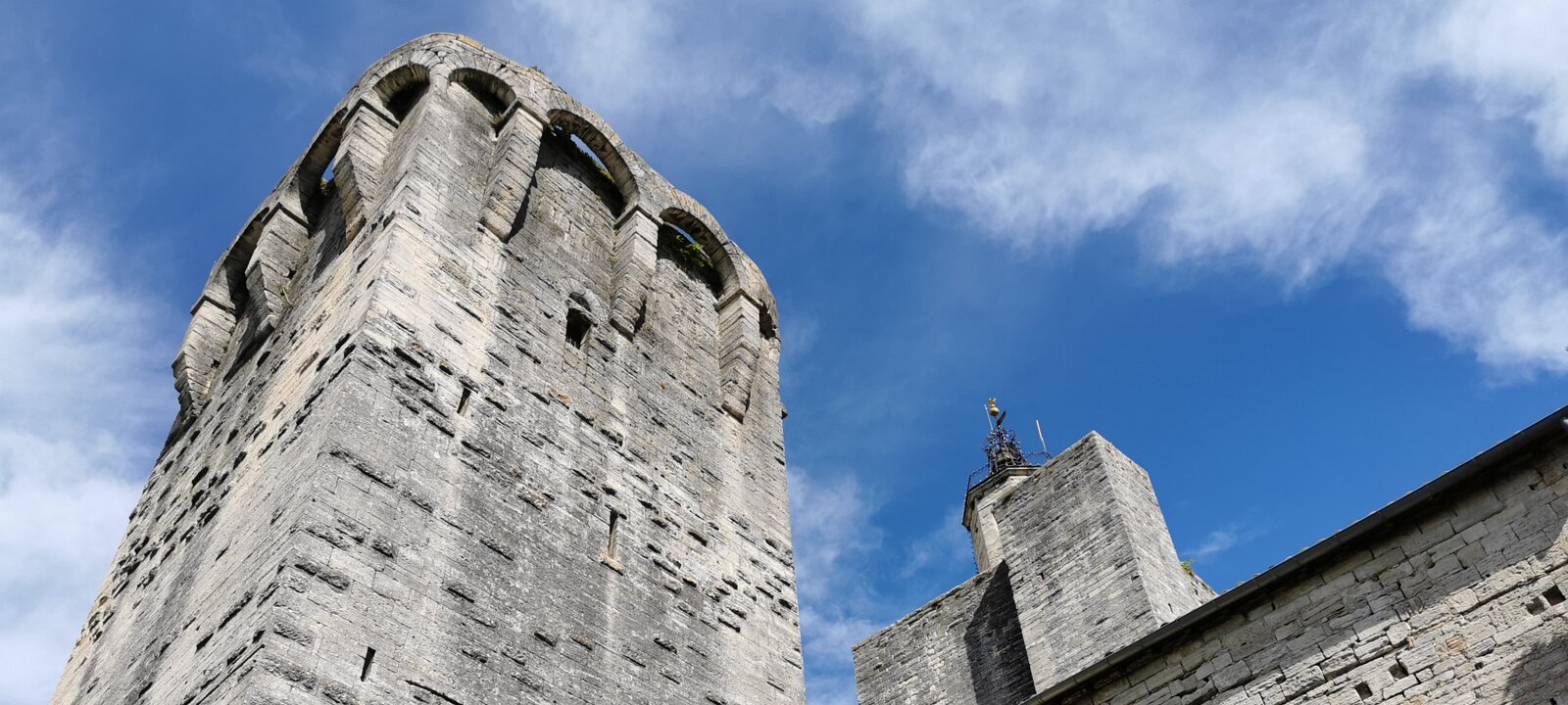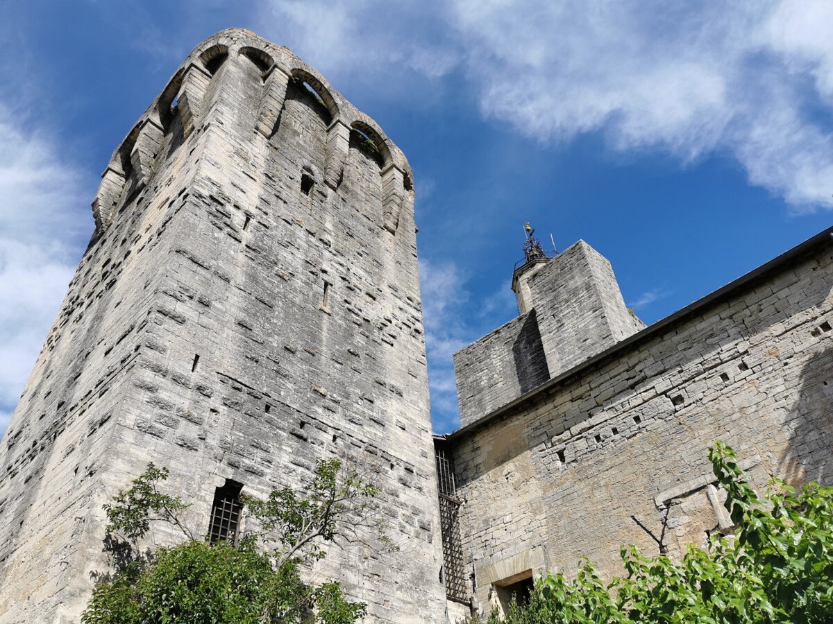 Two of the 3 towers that dominate Uzès, a testimony of the fight for influence during the middle ages. King's tower and bishop's tower, 12-13th… Bishop's tower. 14th century graffitis. DuchéPlace aux herbes Labels