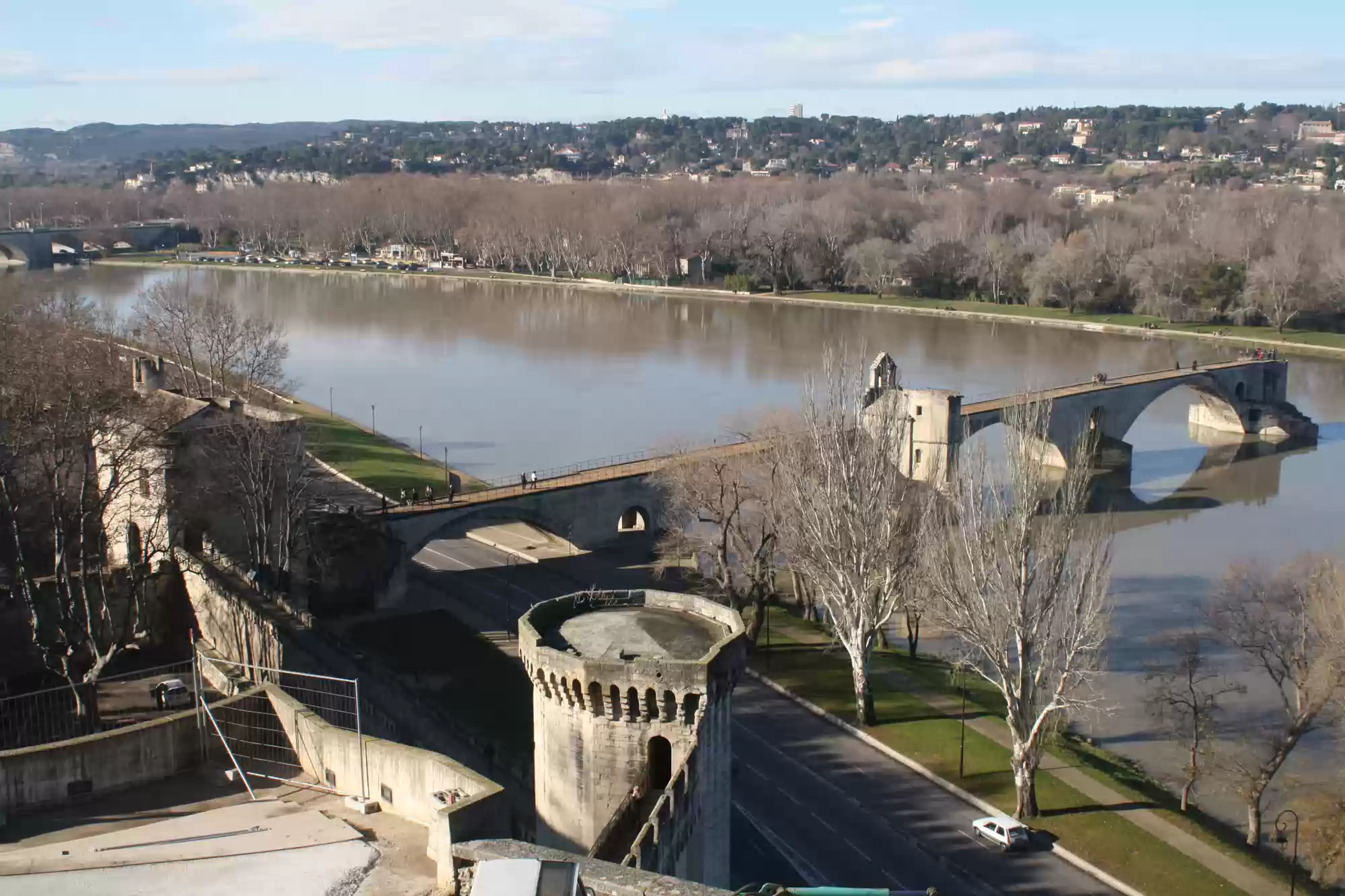 Rhône river, with the partly destroyed Saint Bénézet bridge and Villeneuve-les-Avignon across the river. The tower on the righ side of the…