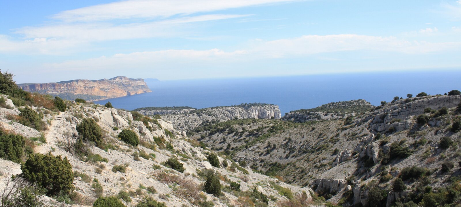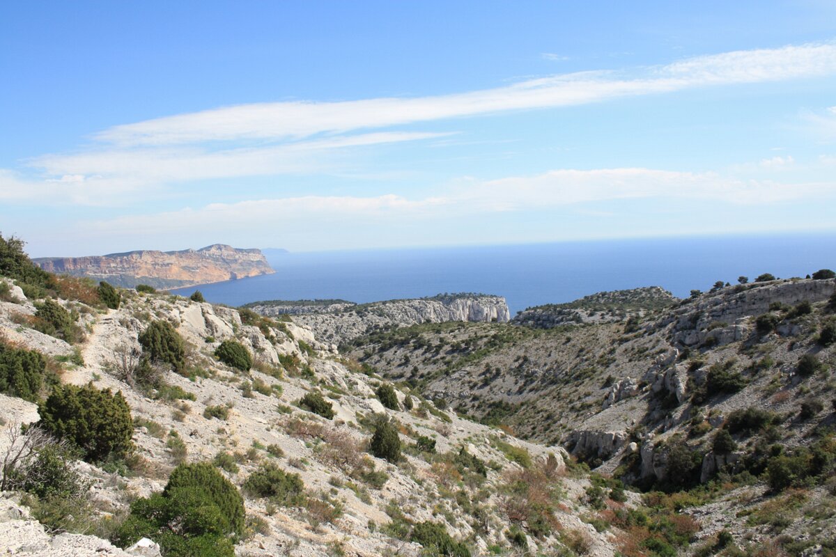 Landscapes of mountain and garrigue (low vegetation that can grow in dry areas in the Mediterranean territories). The whiter area on the mountain (center-right) burned down and has not fully regrown yet. Marseilles. Cassis. SormiouCassis Labels