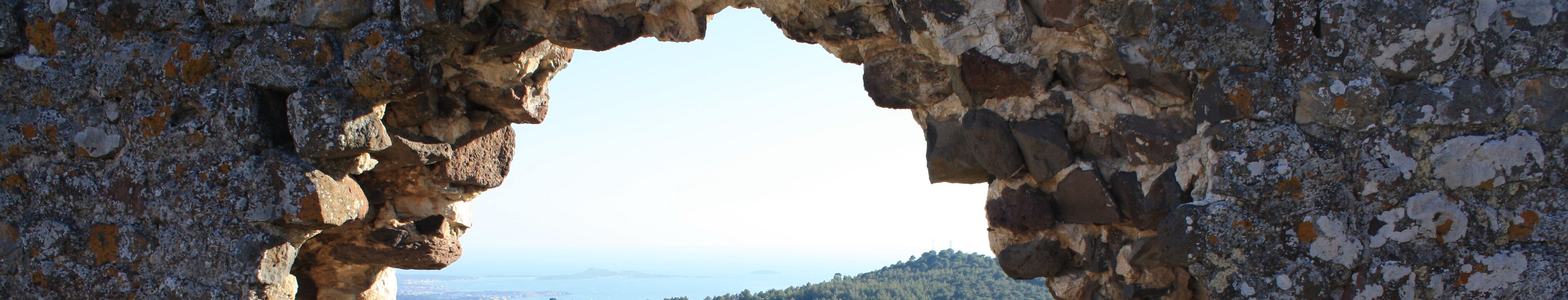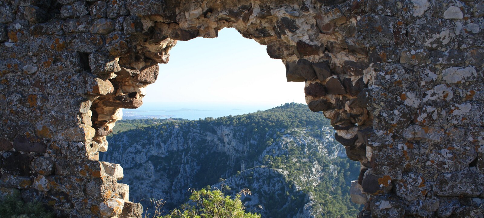 The village of Evenos is built on top of a former volcano with black volcanic stones. The medieval castle (now a ruin) enjoys a wide overview that reaches the Mediterranean shore. The romanesque church. Evenos castle, 11th century. Mediterranean coast. Evenos castle. Evenos castle. Former stone quarry, across Evenos. Fort du Pipaudon, 19th century. CotignacEyguières Labels