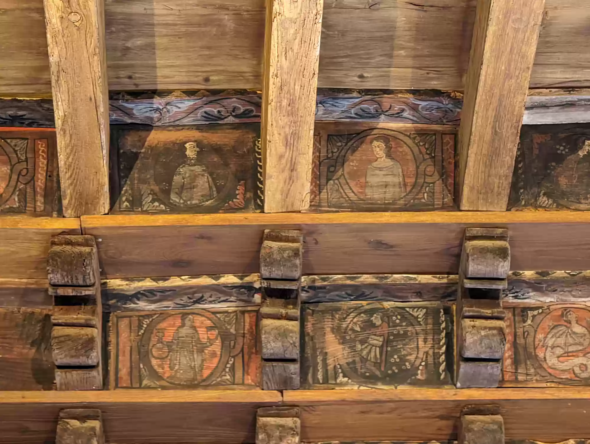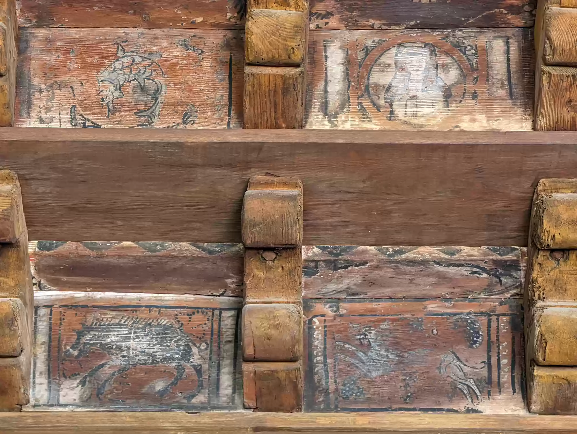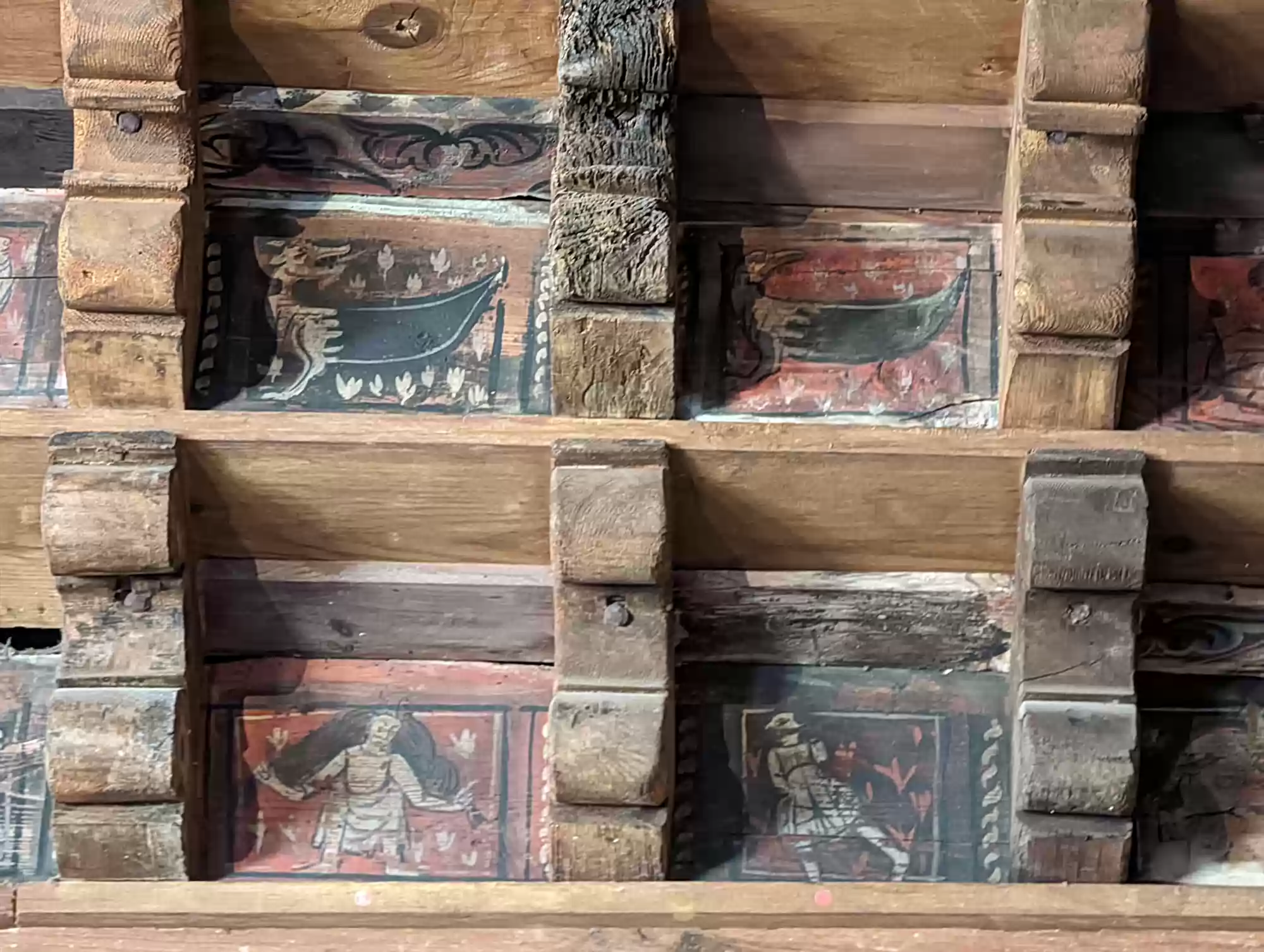PXL_20240615_105221218 The ceiling was made in larch wood from Alpine forests, a type of wood that is said not to rot. Originally, 1200 small panels were painted, out of which 300...