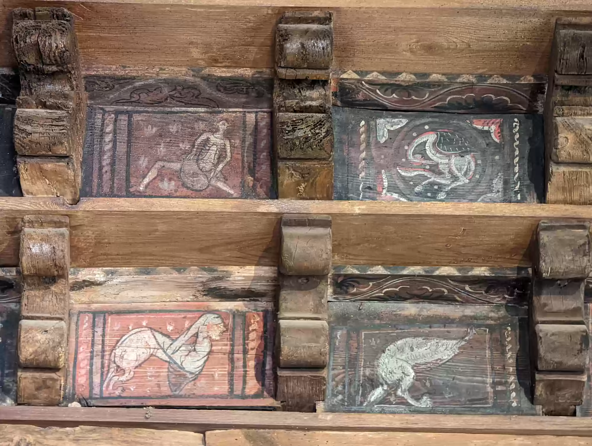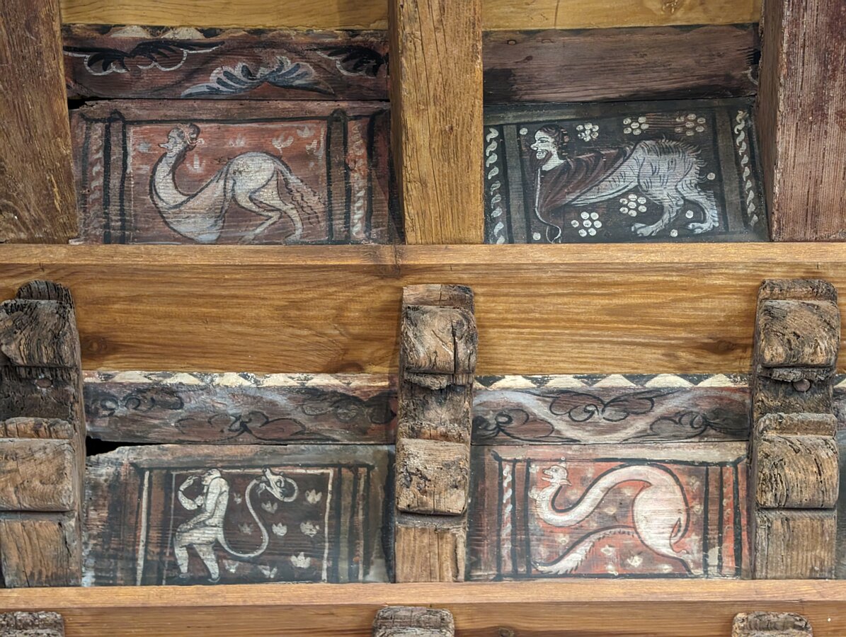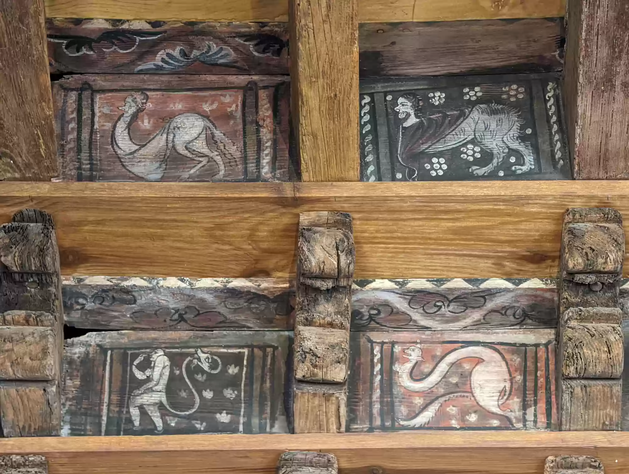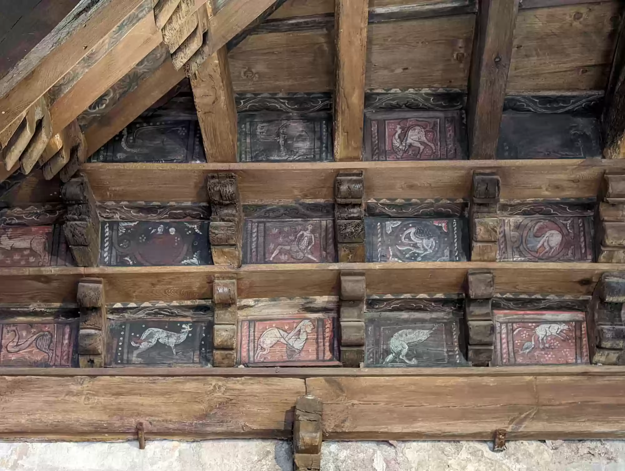 PXL_20240615_105221218 The ceiling was made in larch wood from Alpine forests, a type of wood that is said not to rot. Originally, 1200 small panels were painted, out of which 300...