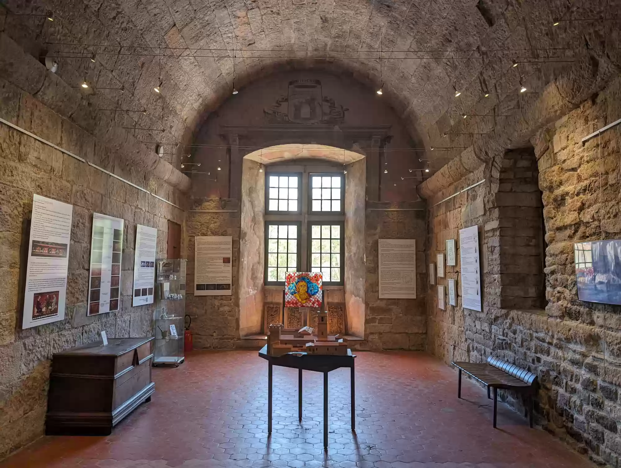 Cloister, 13th century, built of Esterel (a nearby volcanic mountain) stone and Carrara marble columns. The wooden ceiling was built in the 14th century, when…