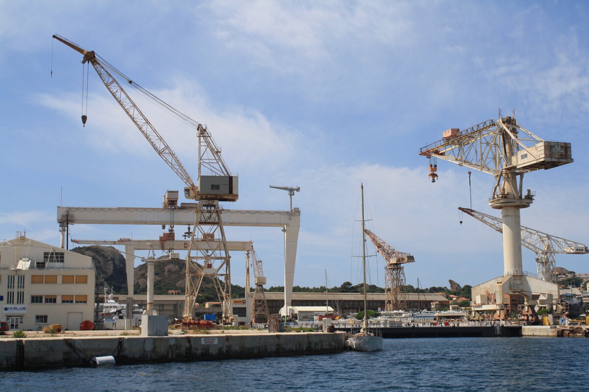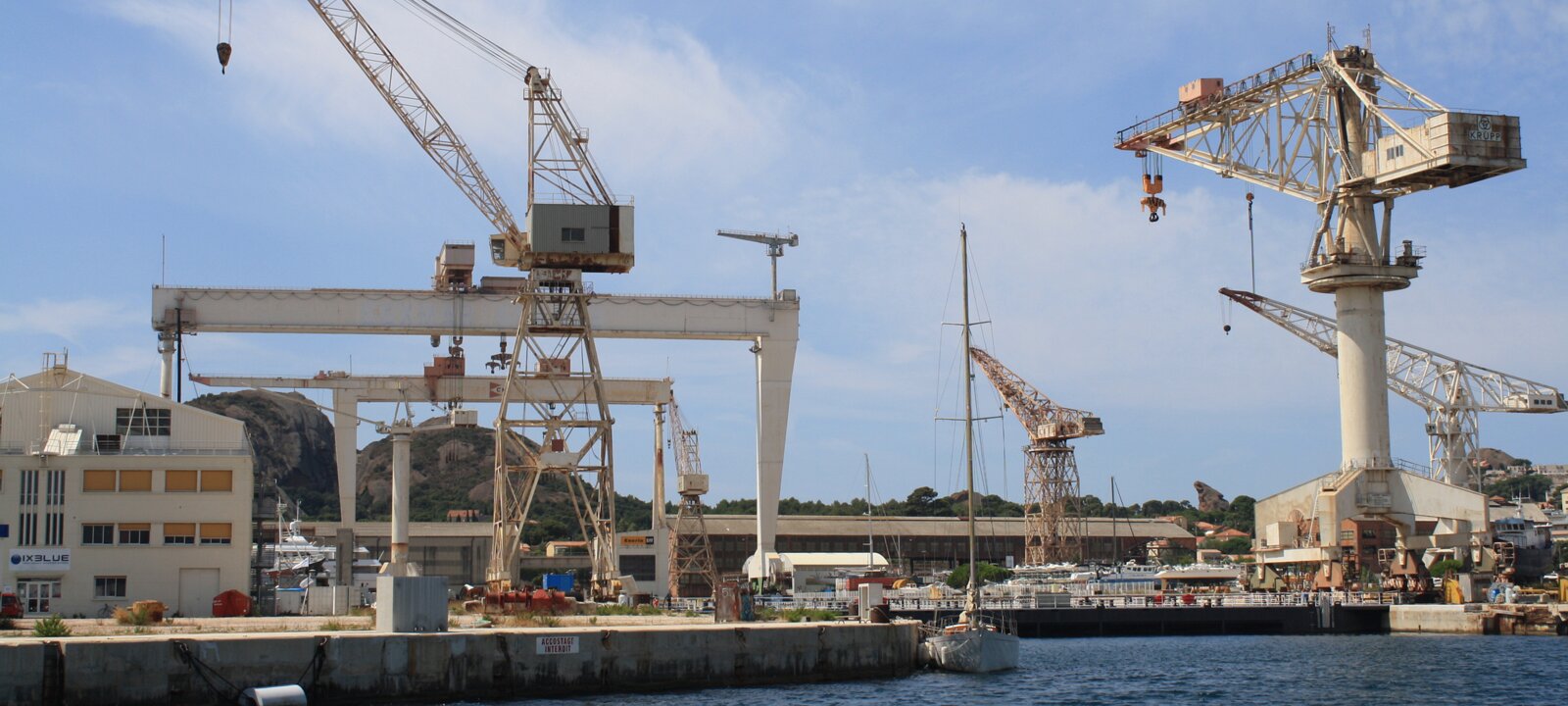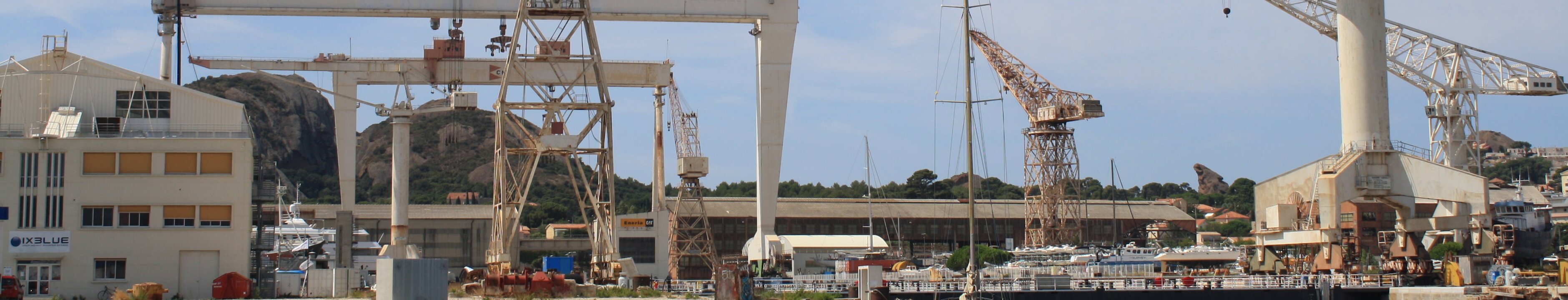 The former shipyards. The naval shipyards which once ensured the wealth of La Ciotat were closed in 1986. Crane used from 1907 to 1986 to move merchandise arriving on a railtrack along the old harbor to another railtrack leading to the naval shipyards. Naval shipyards. Mugel Park Labels