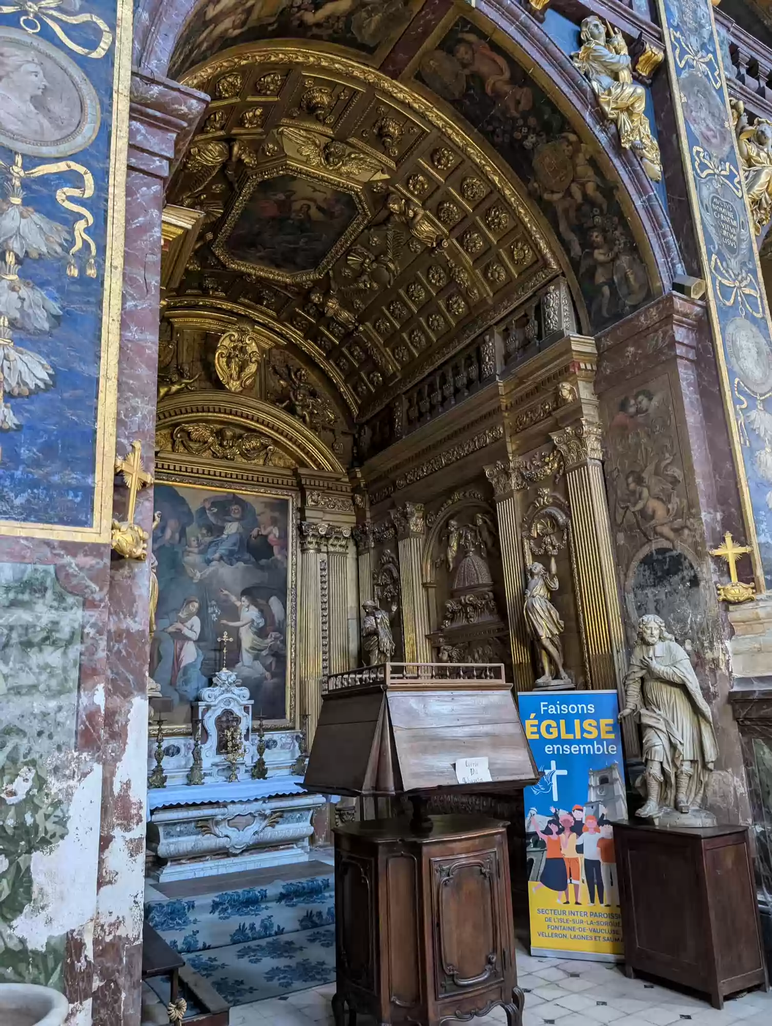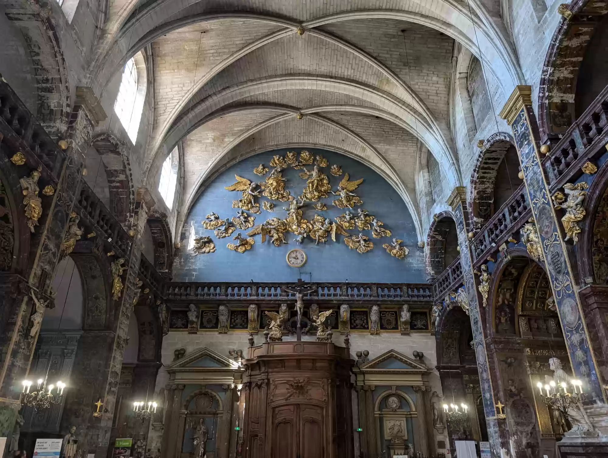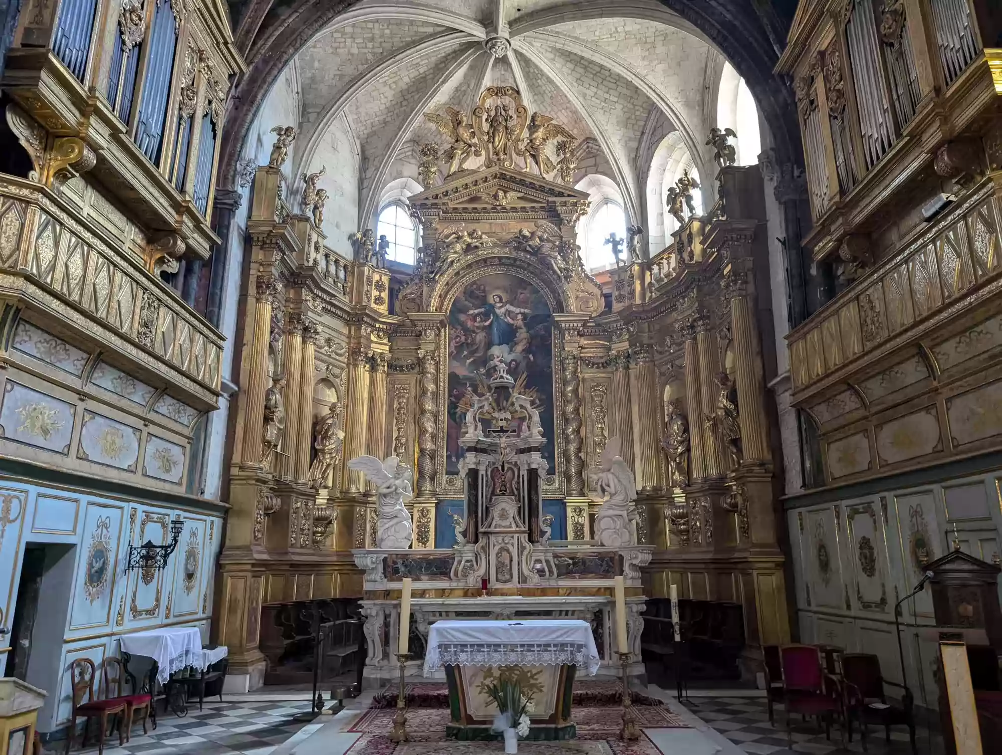 Collegiale Notre-Dame-des-Anges, founded 1212, rebuilt in the 15th century (steeple, apse) and 17th century (nave). Labels