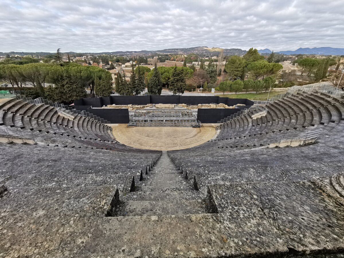 Theater in 1929. Before it was excavated, the theater was completely buried and invisible. Theater, 96 meters diameter, 30 rows, 29m tall, capacity: 6000. Mechanism below the stage. Labels