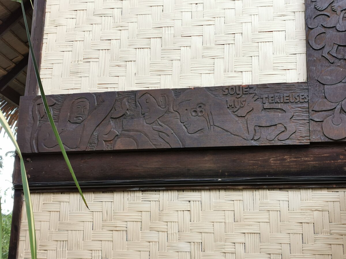Paul Gauguin's house, "La maison du jouir" (rebuilt in the 2000s). The original carvings, by Gauguin himself, can be found in the Orsay museum .