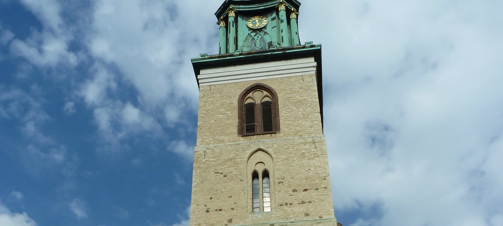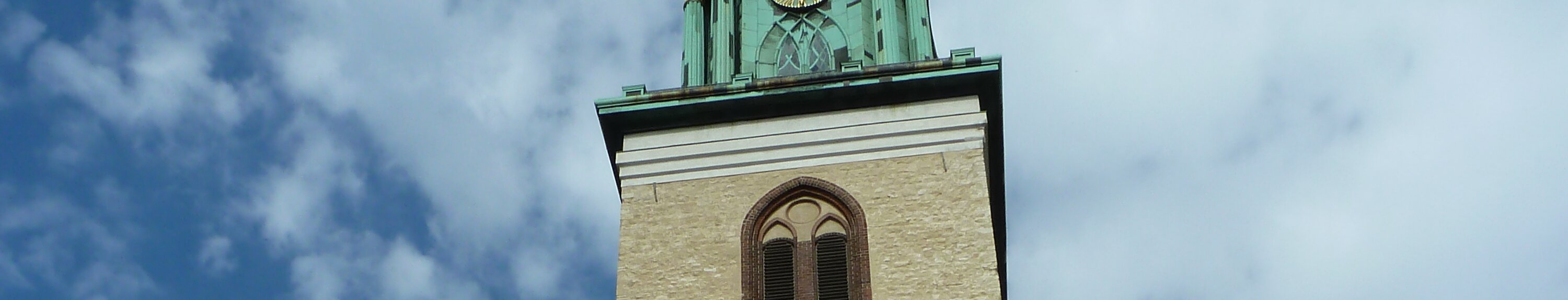 Saint Mary's church (Marienkirche), 13th century. Along with Saint Nicholas church , it is one of the oldest buildings in Berlin. The neogothic tower is from the 17th and late 18th century. Dance macabre (dance of death) fresco, likely painted after the 1484 plague. Dance macabre (dance of death) fresco, likely painted after the 1484 plague. Modern mosaic replica of the danse macabre. Labels