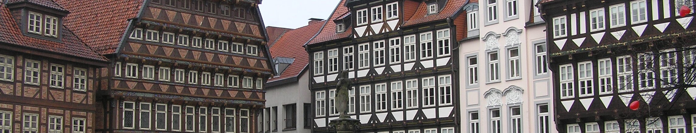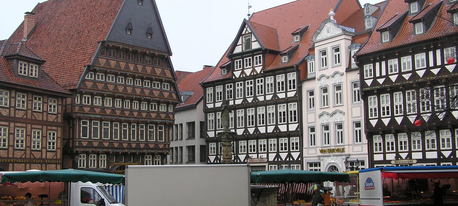 Market square of Hildesheim; most of the town was destroyed during the second World War but many historic buildings were rebuilt thereafter as copies to the…
