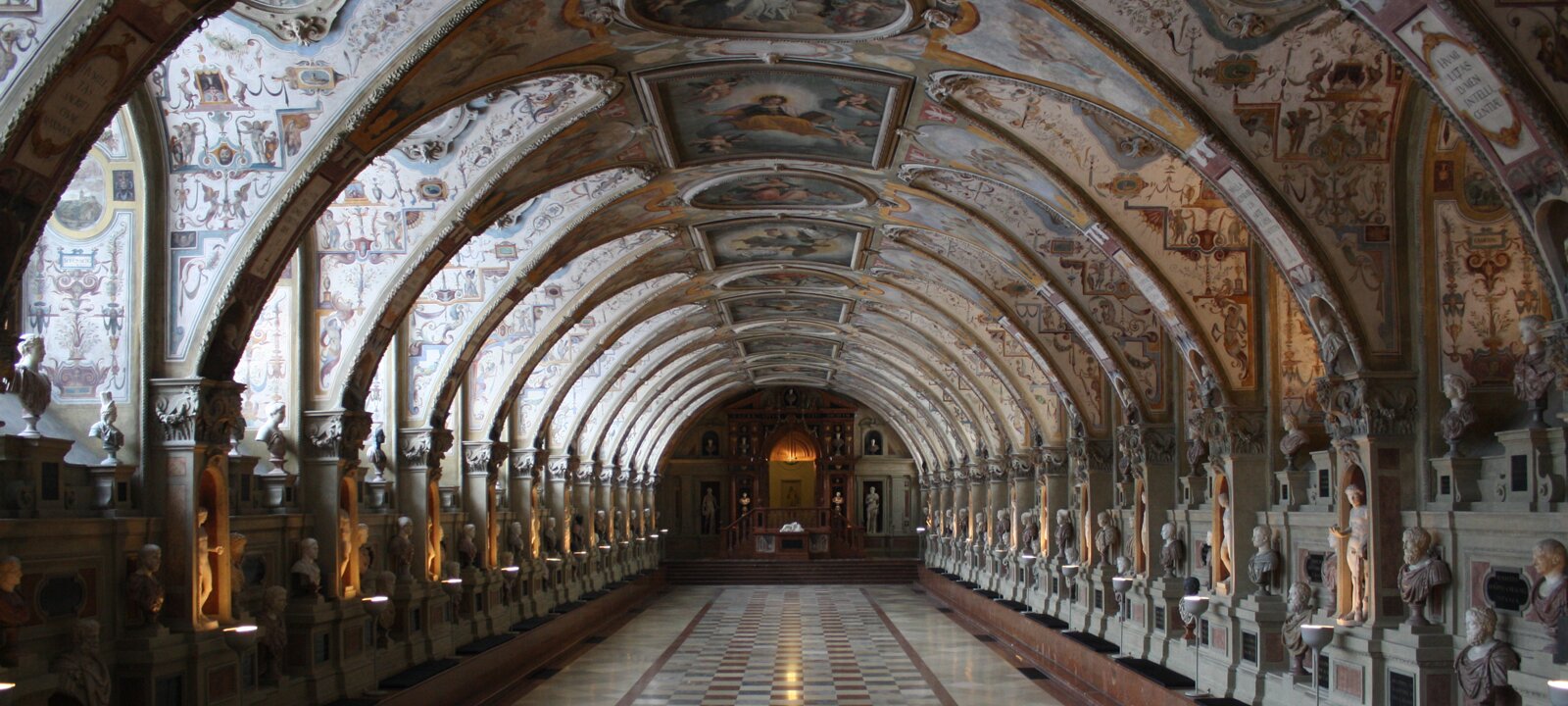 The Residenz was built over the centuries, mainly during the 17th and 19th centuries, for the Bavarian kings. Inner courtyard, in the Residenz. The Grotto, built in 1583, inspired by Italian renaissance gardens. Antiquarium, built 1568-1571 by Duke Albrecht V to host his antiquities. Duke Wilhelm V transformed it into a ceremonial hall shortly after. Antiquarium. Antiquarium. Antiquarium. Antiquarium: Alexander the Great. Antiquarium: Julius Cesar. Electoral apartments, 18th century, decorated in the rococo style. China, 1720-1750. Ornamental writing desk, Antwerp, around 1700. Room of judgement. Marienplatz Labels