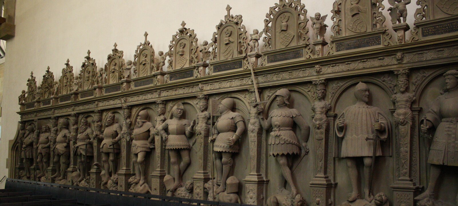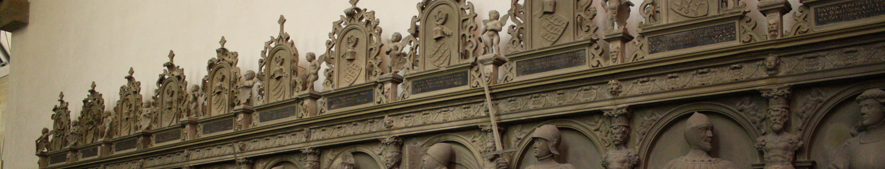 Stuftskiche, built essentially in the 15th century, badly damaged during World War II and repaired thereafter. Length: 68m; Towers: 61 and 63m. West tower, 15th century. West tower, 15th century. Late 16th century gallery of the dukes of Württemberg. Renovated interior of the church. The dukes of Württemberg are buried in the church. Schlossplatz Labels