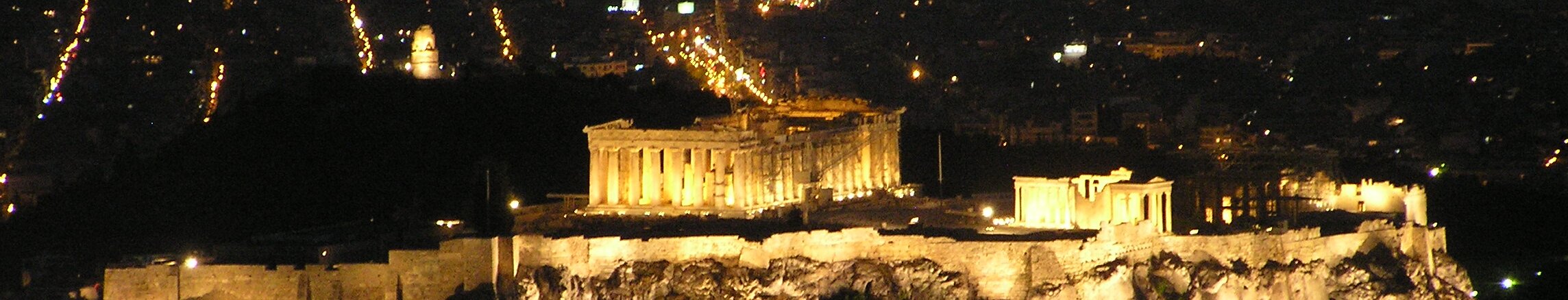 Acropolis and Piraeus seen from the Lycavettos hill. By night. Parthenon seen from the odeon of Herodes Atticus. A stadium next to the Acropolis. Open air swimming pool next to the Acropolis. Arrival of the Marathon-Athens race below the Acropolis. The departure line is in Marathonos and the arrival line is in Kallimarmaro stadium . Slopes Labels