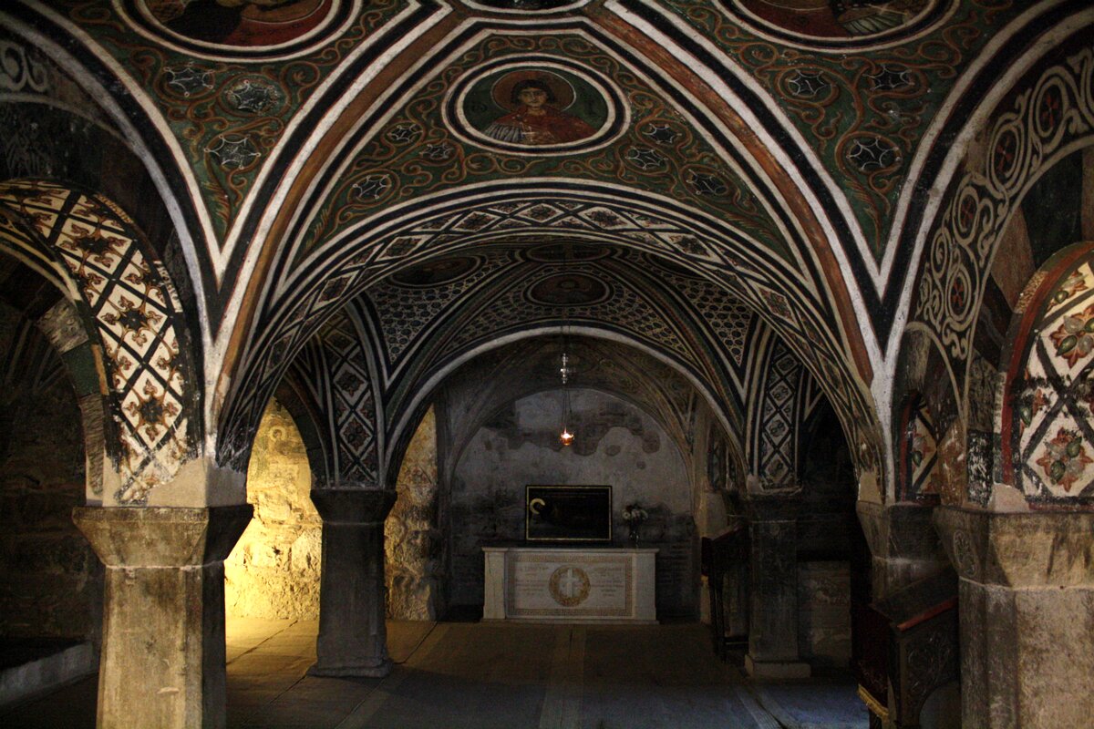 The crypt was built in the 10th century. Grave of Saint Luke (Hosios Loukas) in the crypt dedicated to Saint Barbara, below the katholikon. Passion of the Christ. KatholikonMuseum Labels
