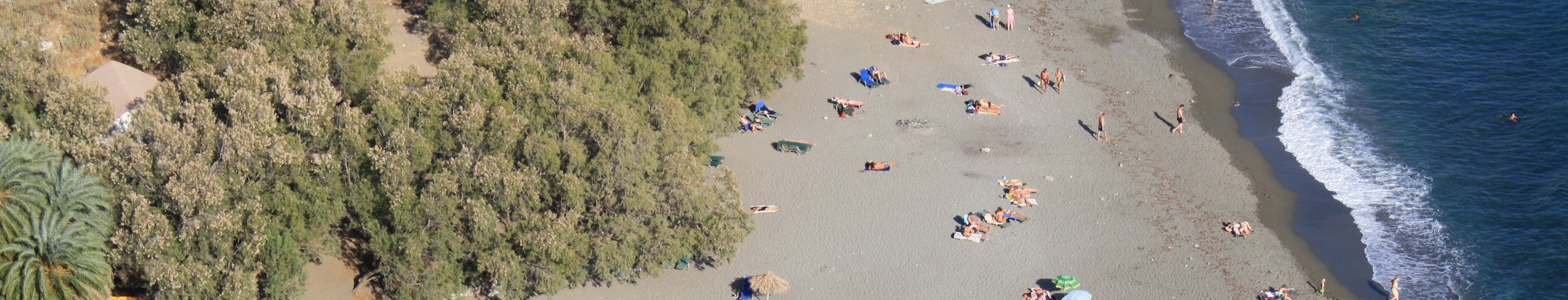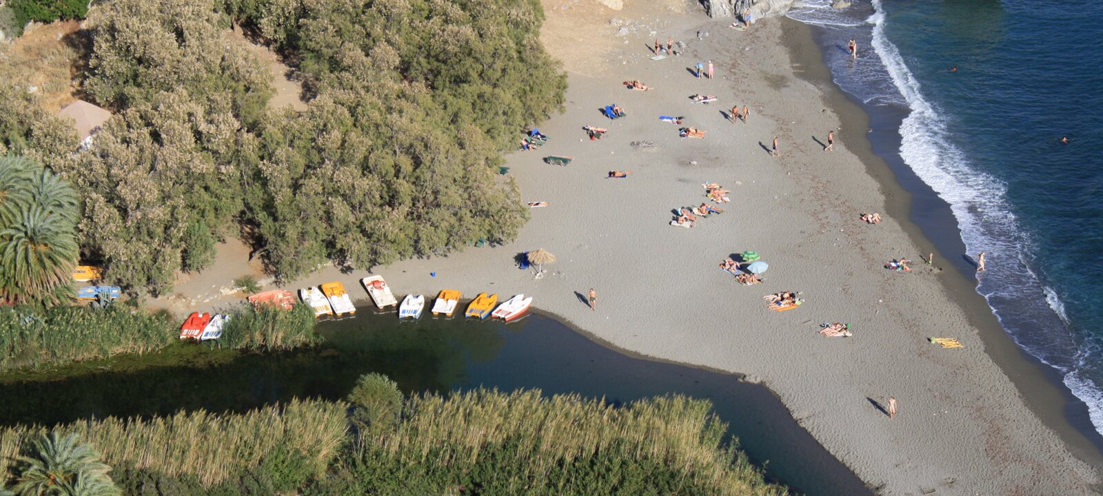 Beach of Moni Preveli, where a river waters a palm tree forest.