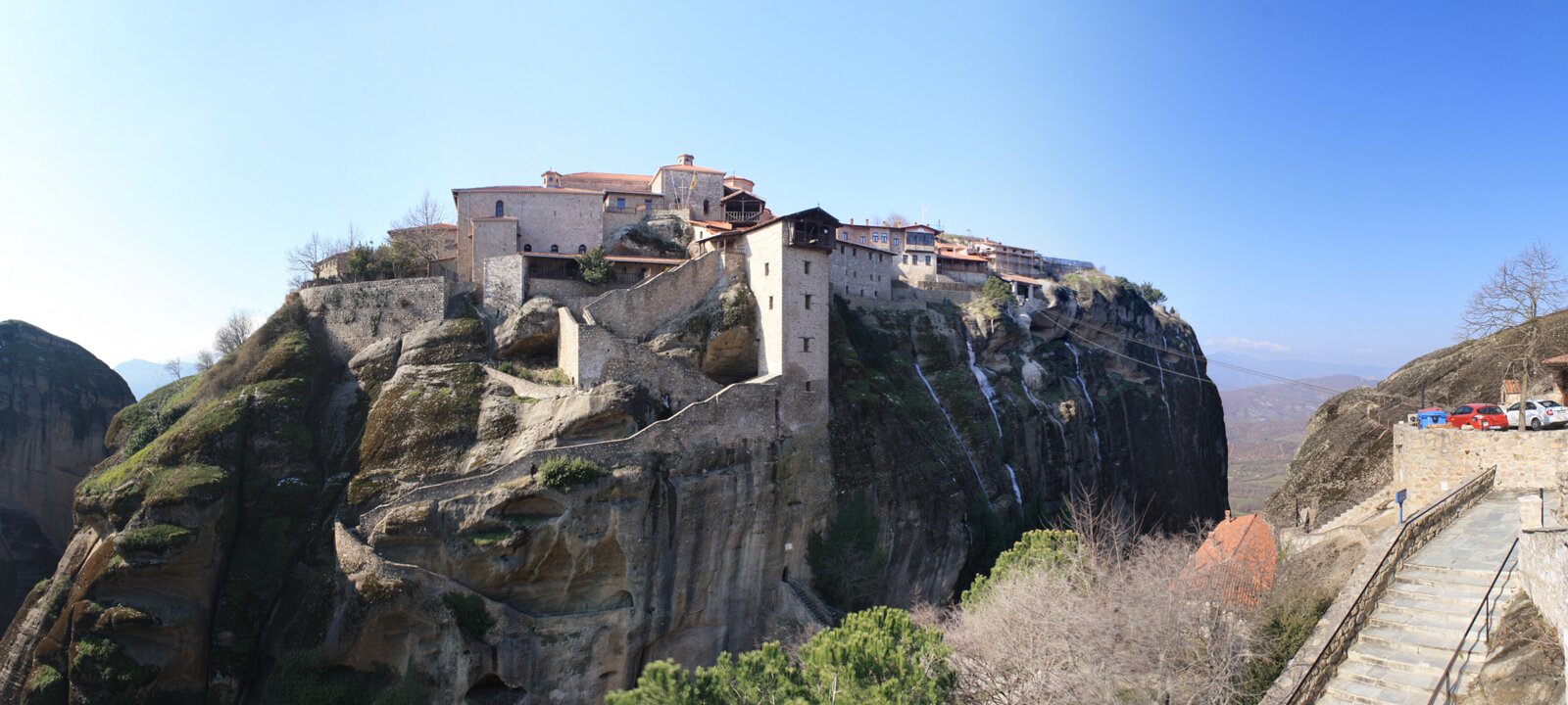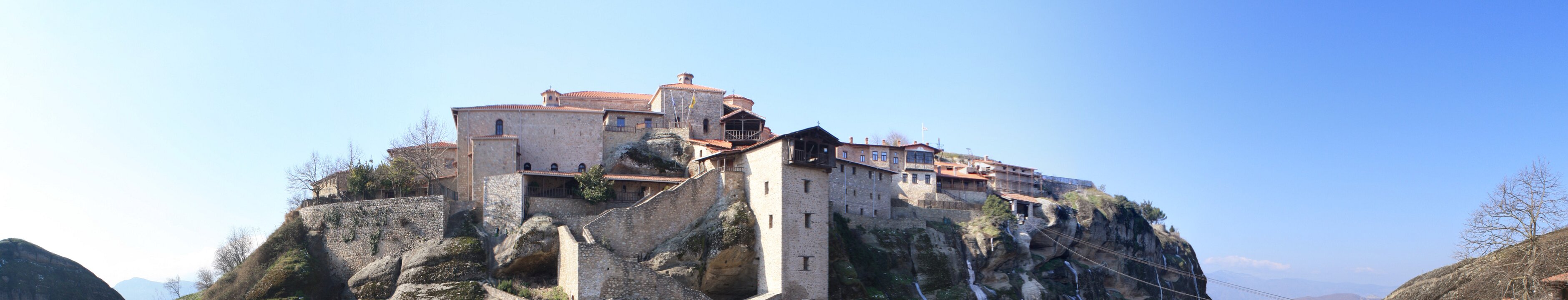Great meteoron: the rope tower; monks and goods used a basket and rope as a rudimentary elevator, until steps were carved in the rock in the early 20th century. Church on Great meteoron. Kitchen in Great meteoron. Ossuary in Great meteoron. Holy Trinity (Agia Triada) Labels